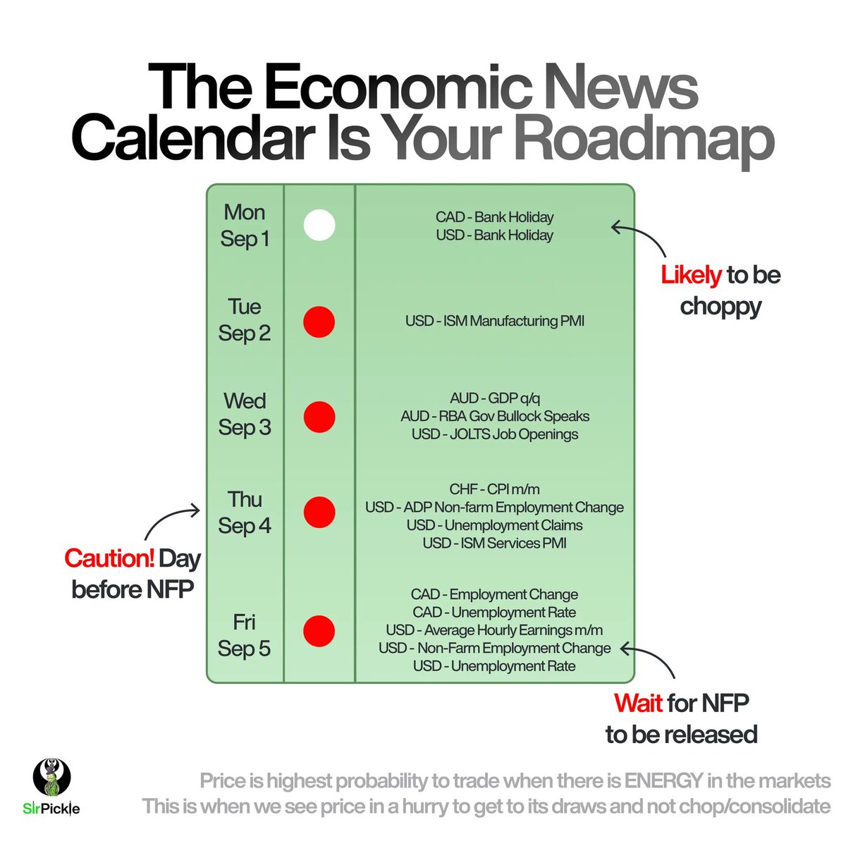 So, to be aware of this: Go to forexfactory.com/calendar and ask yourself: โWhere are the high impact news events laid out for this week? Which assets are they on? Is there Big 3 news events? Is there a bank holiday?โ
