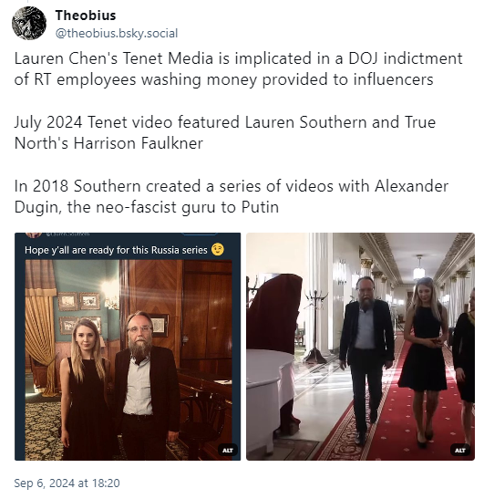 Lauren Southern, implicated in the DOJ indictment charging Russian media network RT of paying her and other social media influencers through Tenet Media, has not posted anything on X since the information went public Sept 4.pressprogress.ca/far-right-mediโฆ