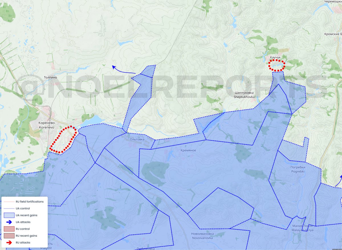 In the Korenevo direction, two adjustments were made in favor of Russia. The AFU was pushed back from the Korenevo settlement (not to be confused with Korenevo city) and Russia restored some of their positions south of Kauchuk.