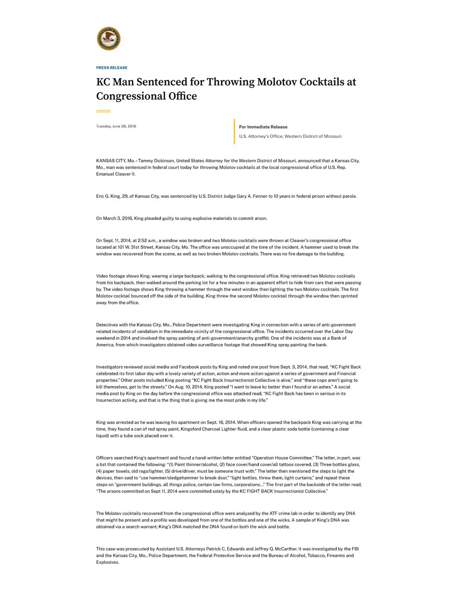 In the Business Insider interview, BI sanitizes it as “two Molotov cocktails” thrown at “an empty federal building.” DOJ’s version is clearer: the devices were thrown at Rep. Emanuel Cleaver II’s congressional office, and investigators say King was also linked to a string of anti-government vandalism incidents around Kansas City. When he was arrested, he was carrying materials consistent with more firebomb attacks.