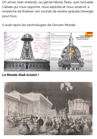 11/n : En fait, cette illusion est partie d’une supposée (re)découverte de Nicola Tesla, peu avant sa mort (son assassinat, disent-ils…) sur la possibilité du transport de l’énergie sans fil. En fait il y a réellement travaillé, mais s’est totalement ruiné en vaines recherches…