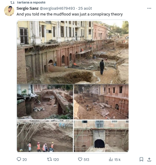 18/n : Mais tout cela connut une fin. En 1892 pour certains, 1885 ou peu après 1860 pour d’autres. La «Grande Coulée de Boue» ensevelit toutes ces merveilles. Les Tartariens ont une sorte d’Atlantide, ils leur fallait un déluge, et donc ils en ont inventé un de toutes pièces..