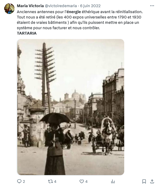12/n : Nos conspis sont donc persuadés qu’il a existé de nombreux moyens de puiser l’énergie dans l’ « éther », puis de la transporter par un réseau d’antennes. Cela a abouti à une fantasmagorie proche de l’imaginaire steampunk évoquant ainsi un paradis perdu.