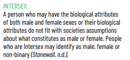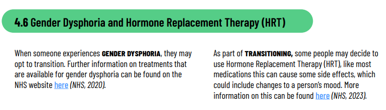 The guide states that 'trans people' use Hormone Replacement Therapy, when this is not the same as cross-sex hormones. We also see the genderbread person cited as a good source of information, and a definition of intersex that is not accurate 3/8