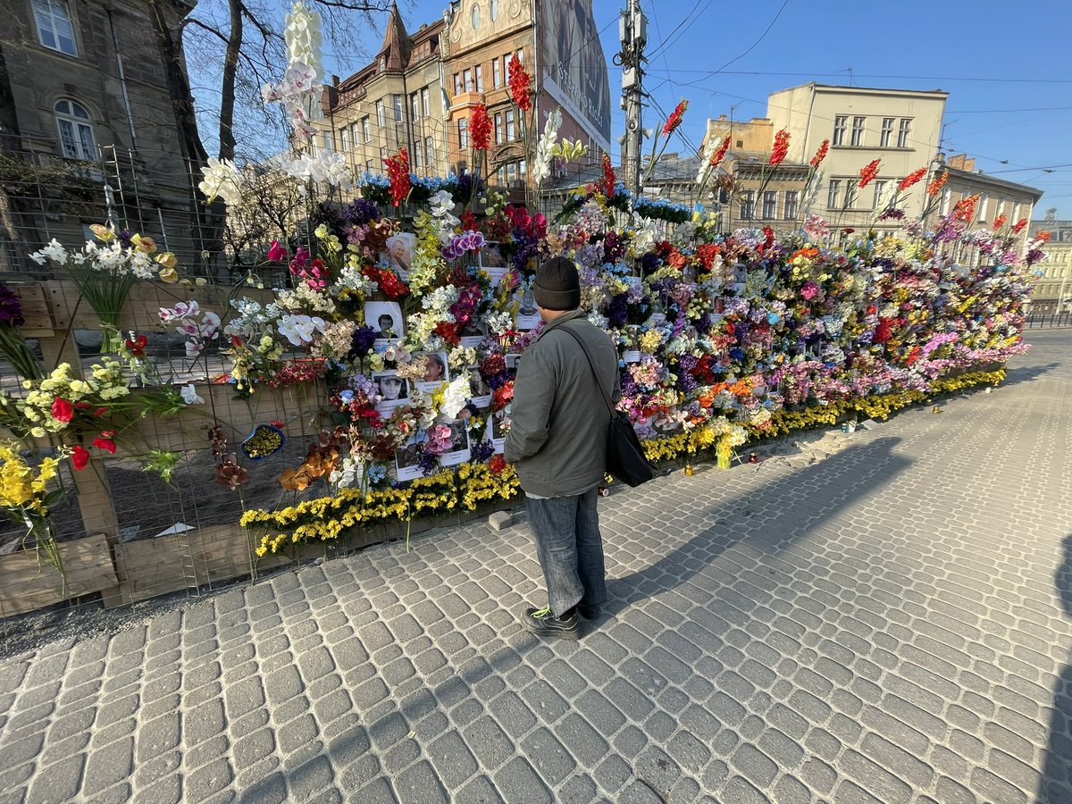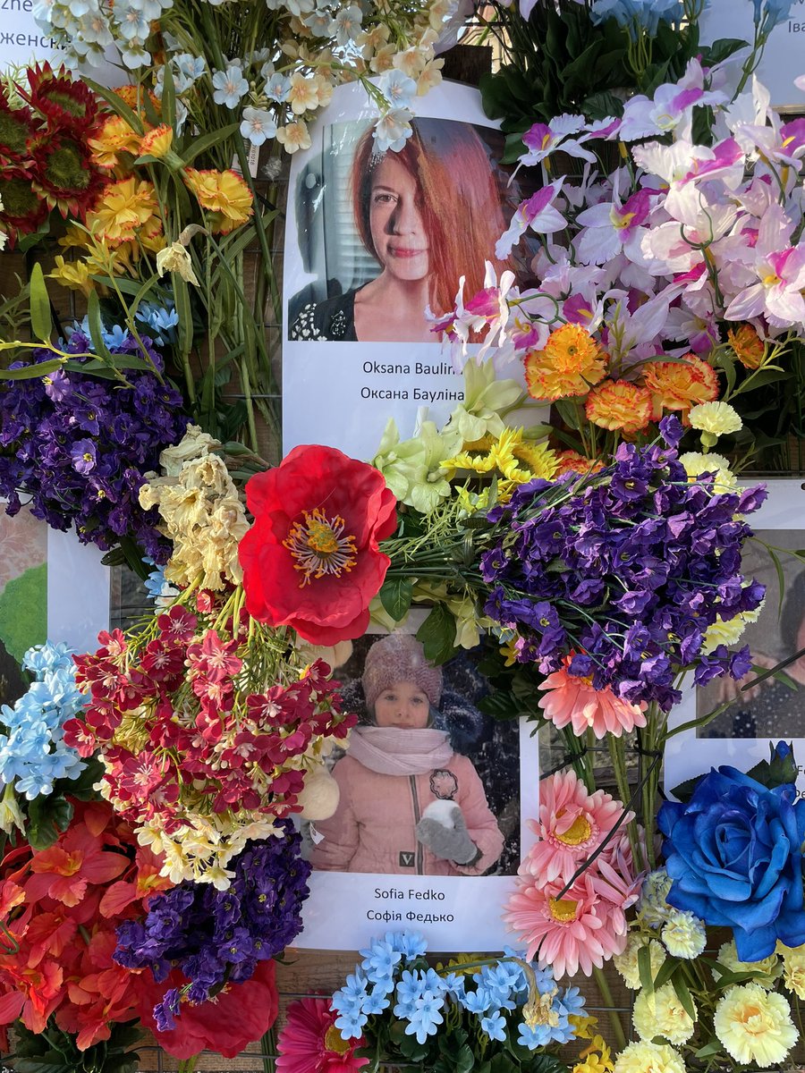 A person in Lviv this morning stares at portraits of people murdered by Russian soldiers.