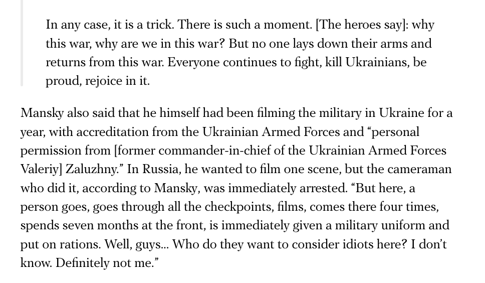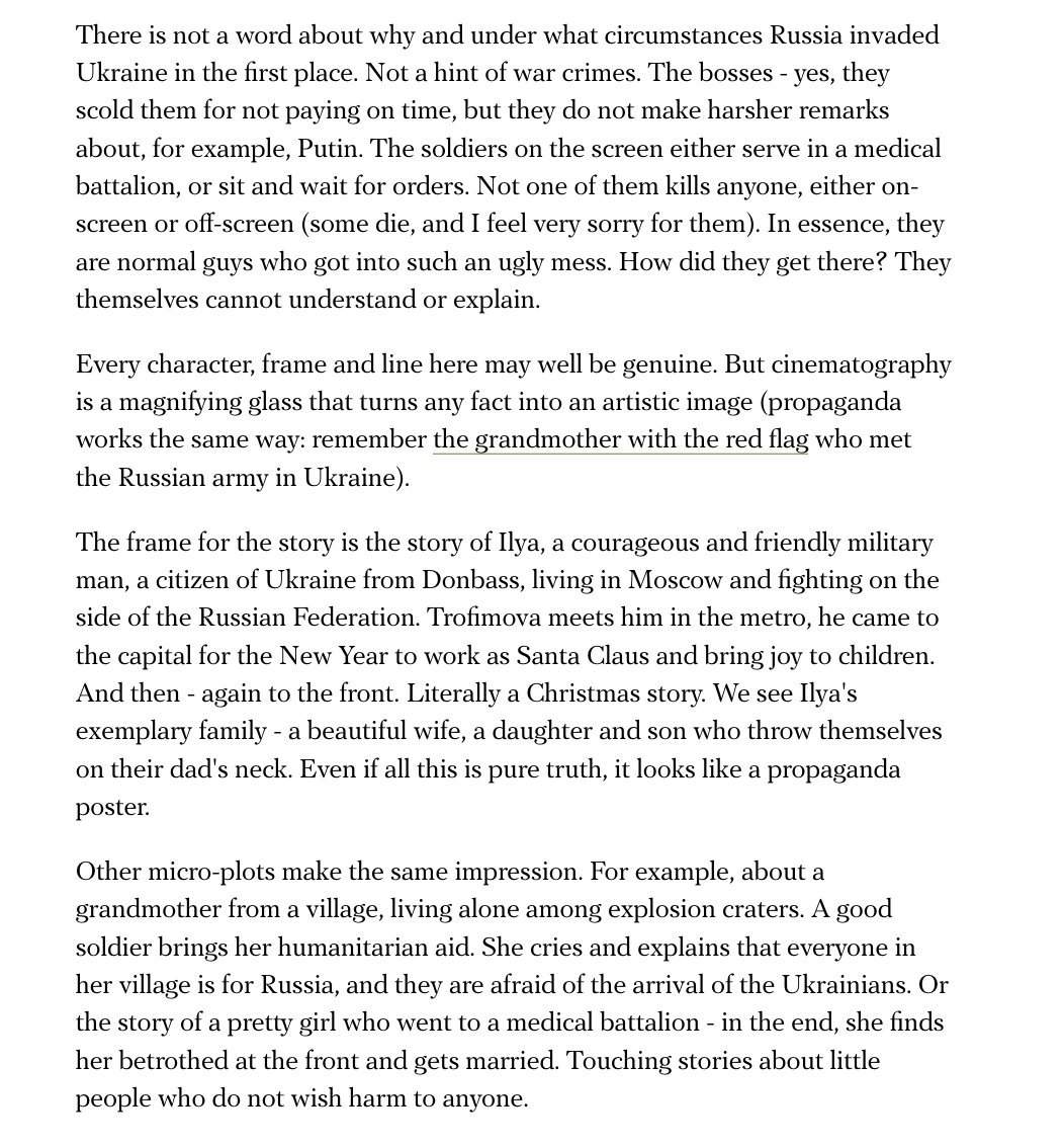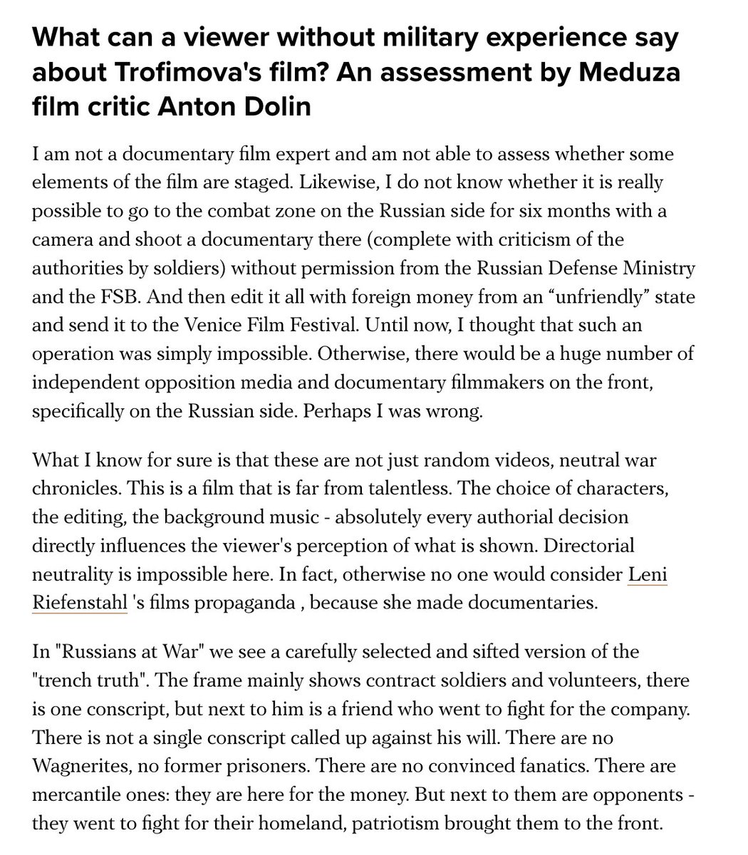 Russian media organization @meduza_en gave a review of the film "russians at war" and gave the assessment that it is "a carefully selected and sifted version of the trench truth" questioning why it shows no conscripts, no Wagnerites, no prisoners, no evil... 🧵1/4