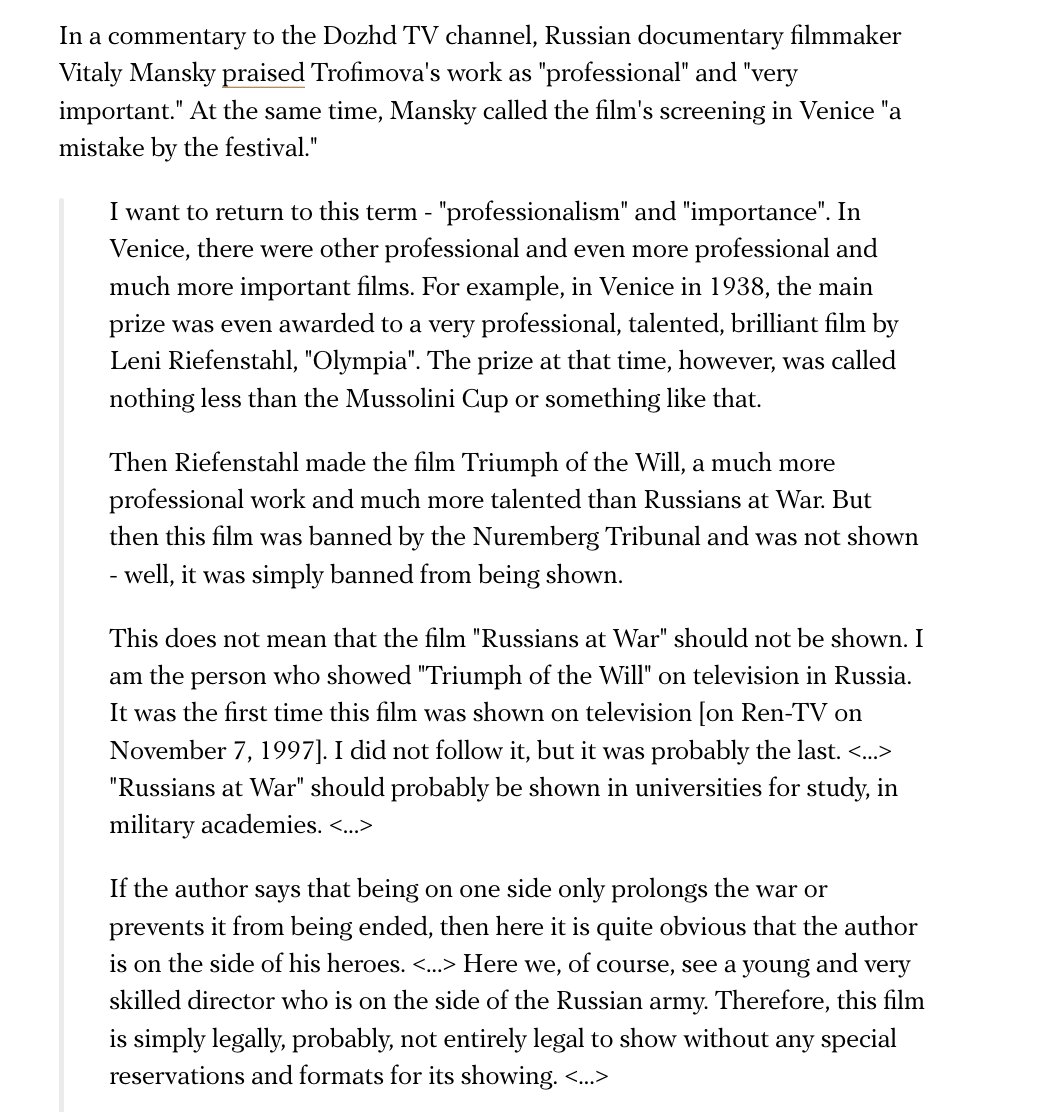 Russian doc filmmaker Vitaly Mansky says that this film was very professionally done and so were the films of Nazi propagandist Leni Riefenstahl