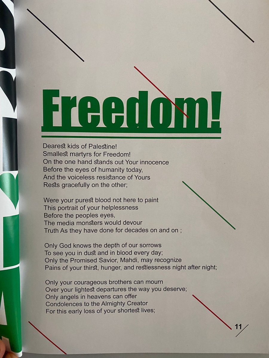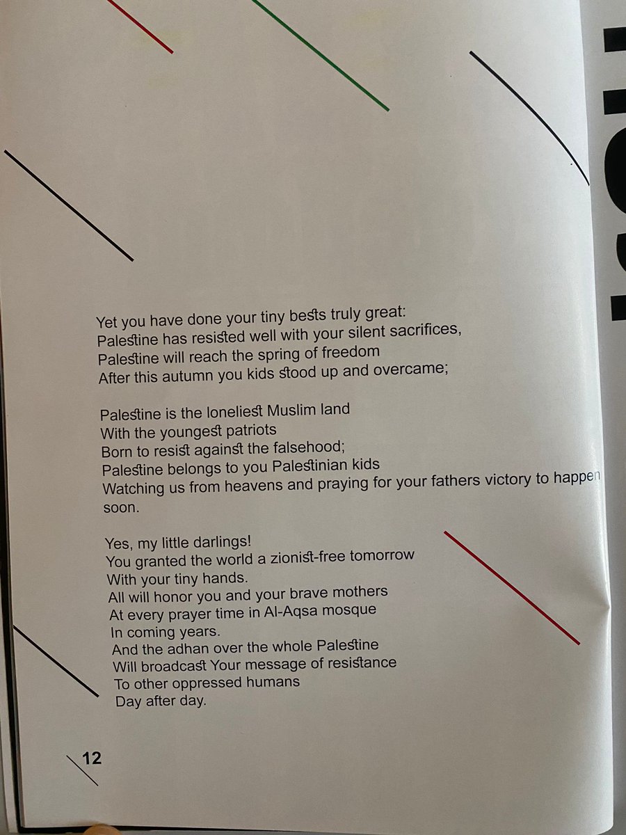 Pages 11 & 12 include a poem that calls Palestinian children "martyrs" who are "born to resist."