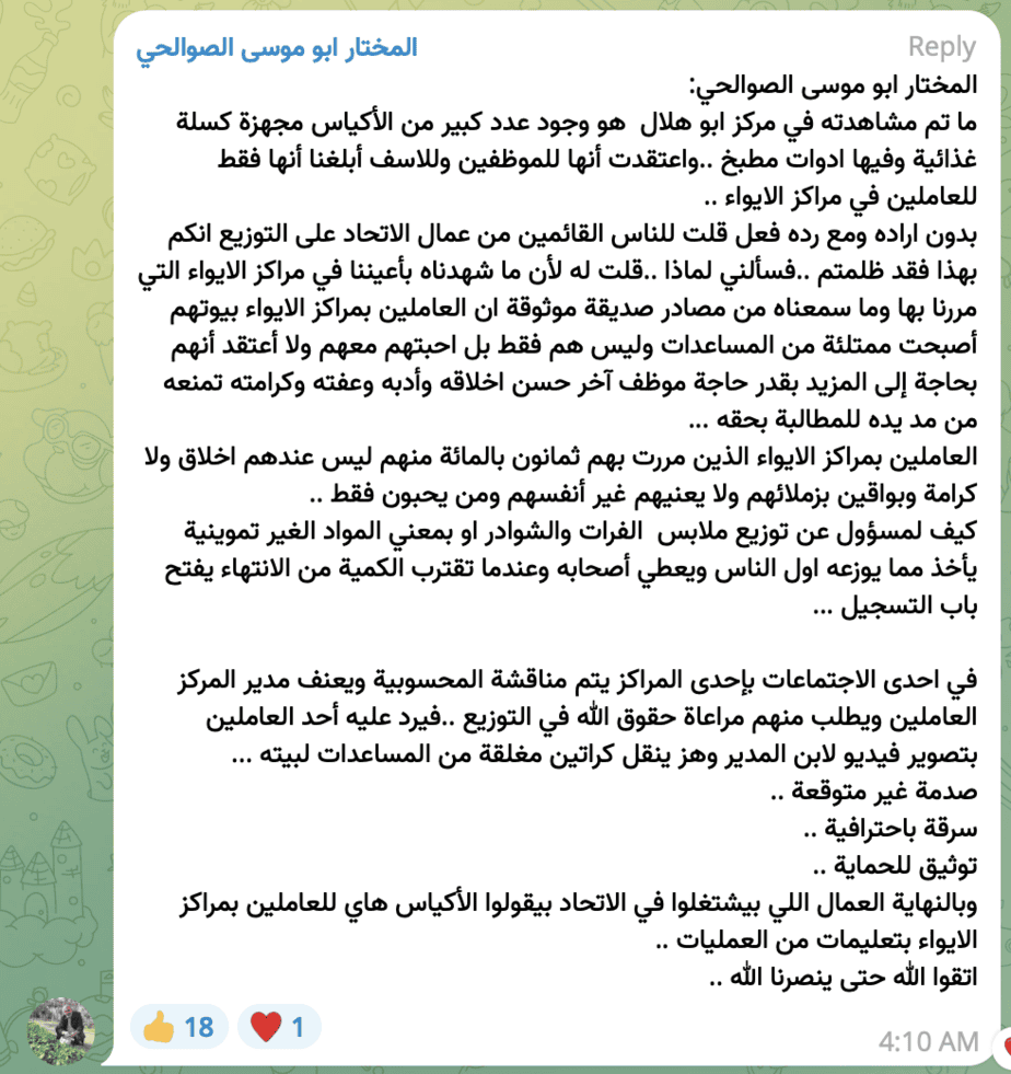 3/ UNRWA staffer Mohammed Musa al-Sawalhi (ID# 10221667) recounts abuses by UNRWA employees: “80% of employees in the shelters have no morals or dignity. They have their homes full of aid and not only them, but their loved ones with them” t.me/jobs6/366164/4…