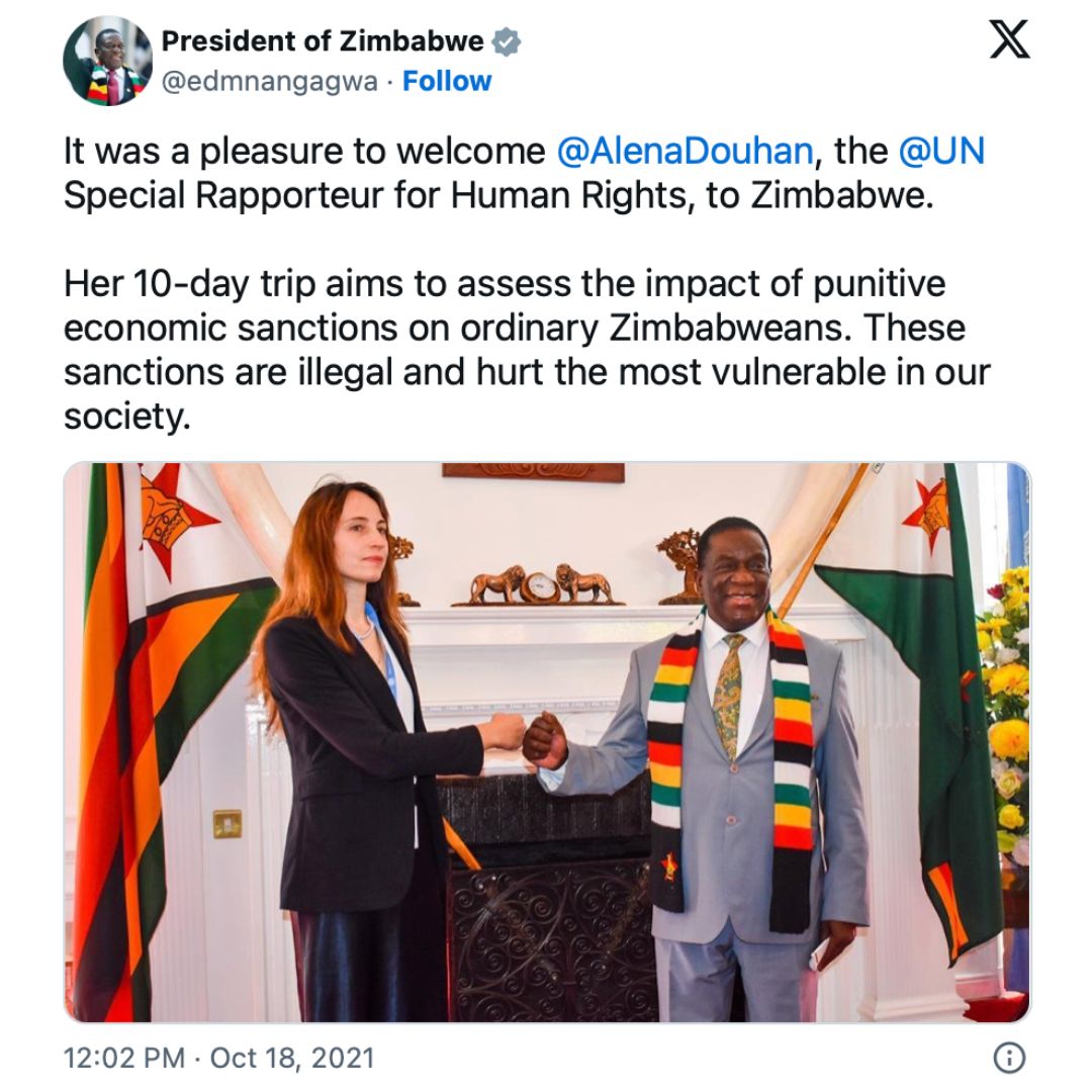Zimbabwe’s regime invited Douhan as part of its campaign to lift international sanctions. During her trip, she met with the dictator Mnangagwa and 26 regime ministers, but refused to meet with members of the opposition or civil society.