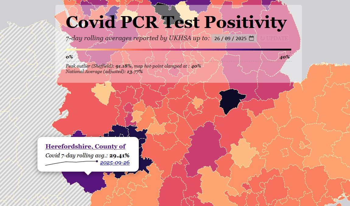 This week's UKHSA data is out, and so our Covid PCR Positivity map has automatically updated with the fresh data.