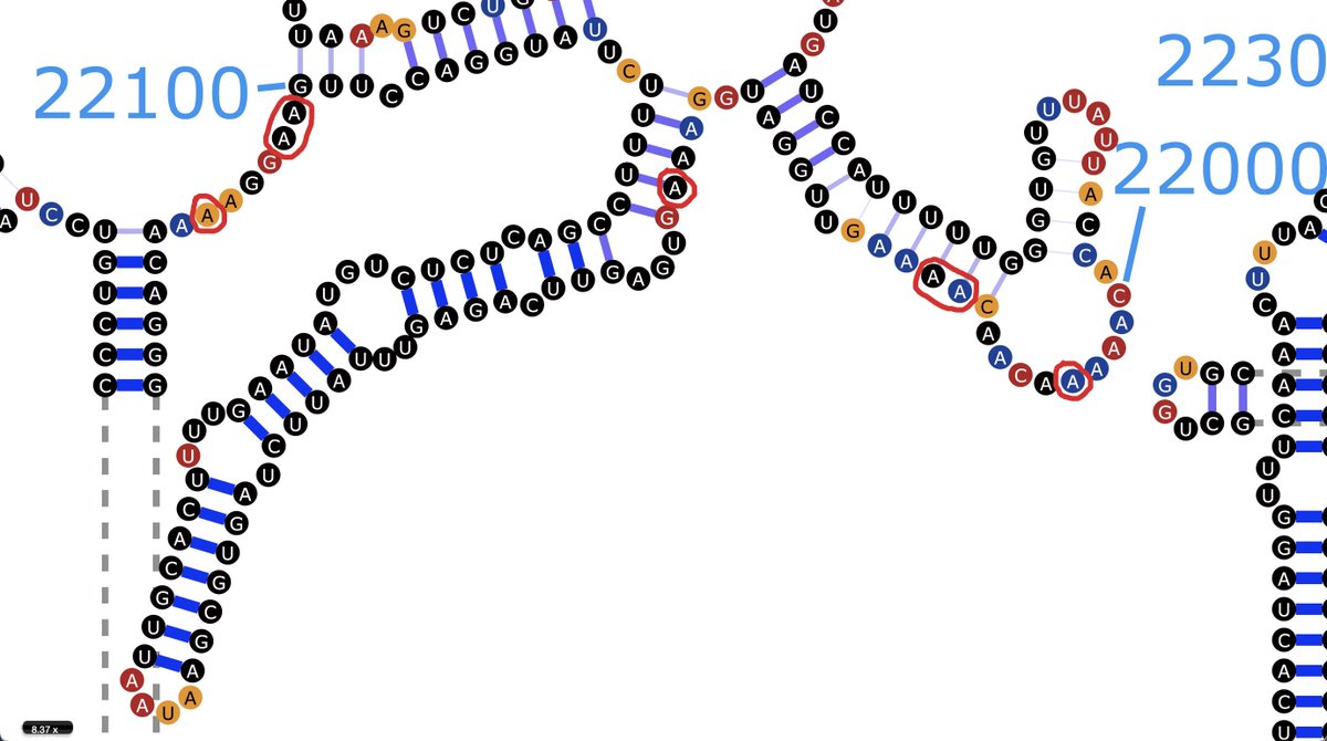 To be clear, I have no idea. I can't recall ever seeing clusters of A->G mutations like this before. There's a human enzyme called ADAR that can causes A->G mutations. Is there something in the JN.1 secondary RNA structure in this region that attracts ADAR? 2/3