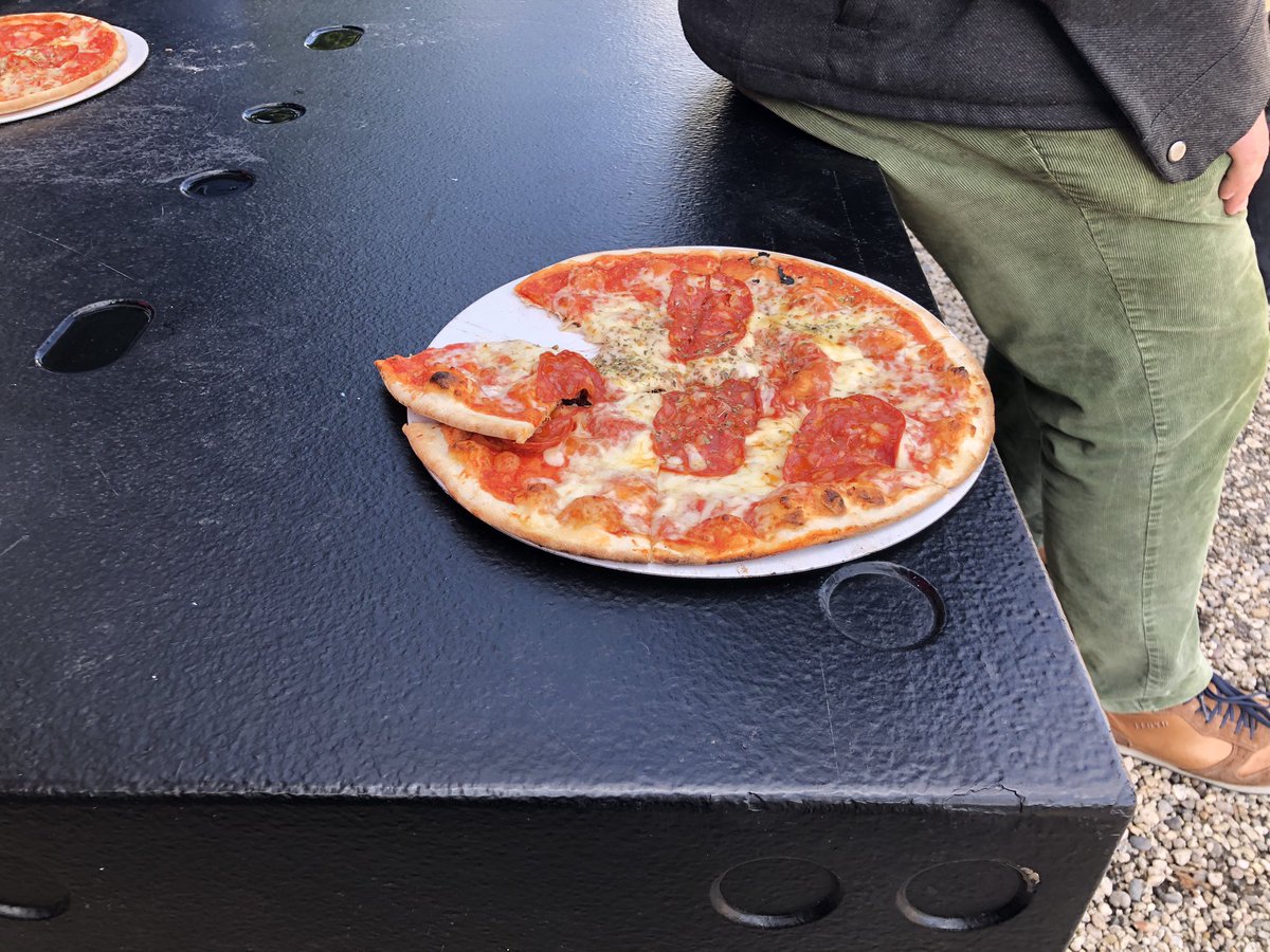 Ik krijg twee stukjes! De medewerker meldt dat hij gaat over de pizza maar niet over inhoudelijke vragen.