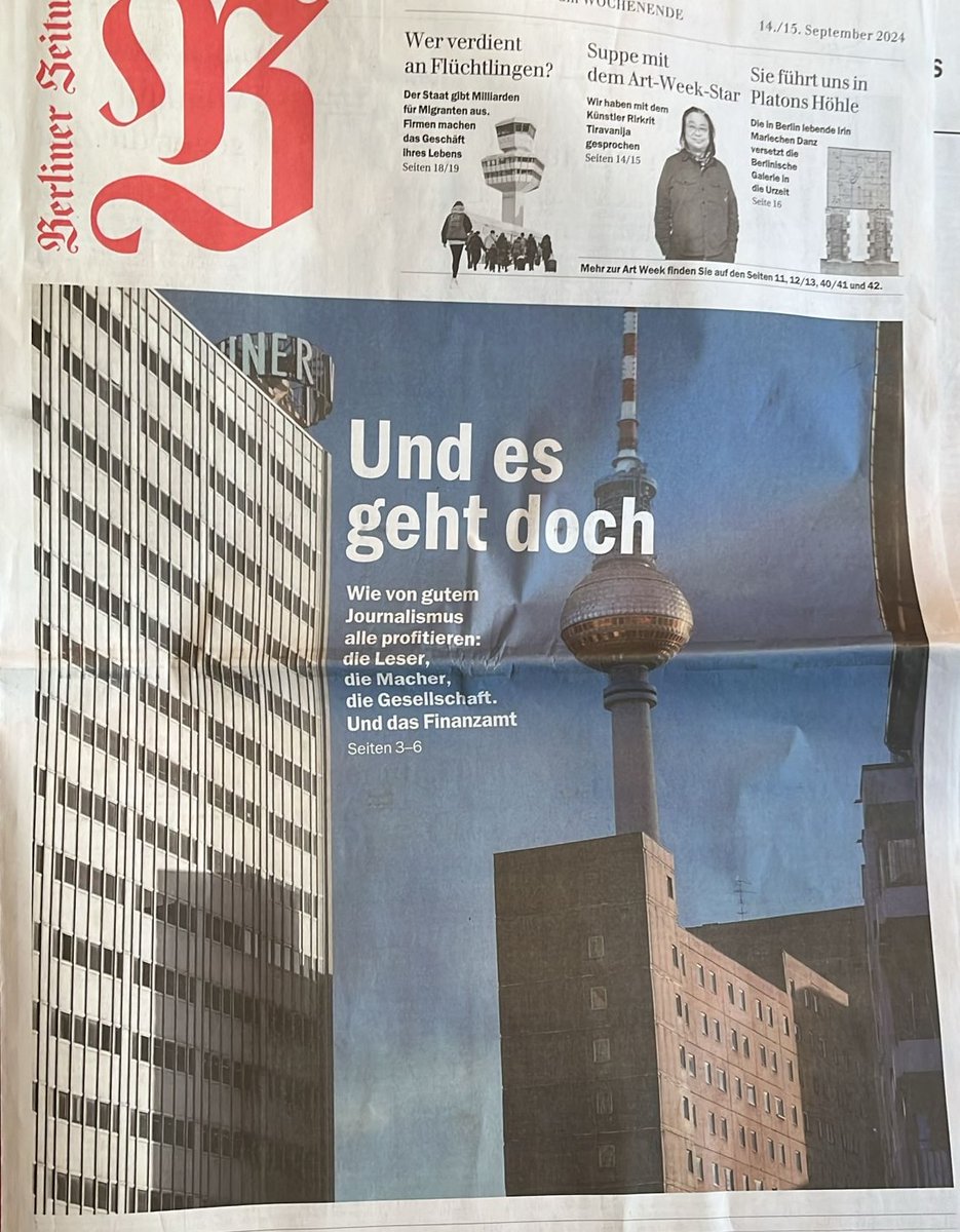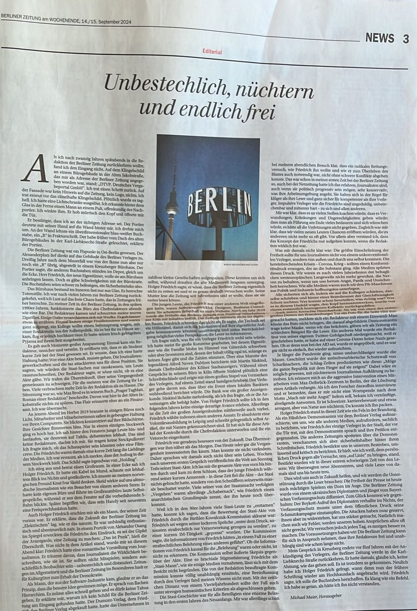 1/In der aktuellen Wochenendausgabe der @berlinerzeitung erschienen mehrere dramatisch anmutende Berichte über die eigene Zeitung. Ist der Anlass nur das fünfjährige Besitzertum durch das Ehepaar Friedrich? Ich weiß es nicht. Die Berlinskaja Prawda, wie ich die Tageszeitung seit