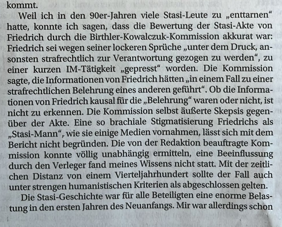 5/wiedergegeben wird, hat mein Interesse auf sich gezogen. Denn dort ist von der „Birthler-Kowalczuk-Kommission“ die Rede, die die Stasi-Akte über Holger Friedrich auswertete und ein Gutachten darüberschrieb. Ist das die journalistische Sorgfaltspflicht, die zum Credo der