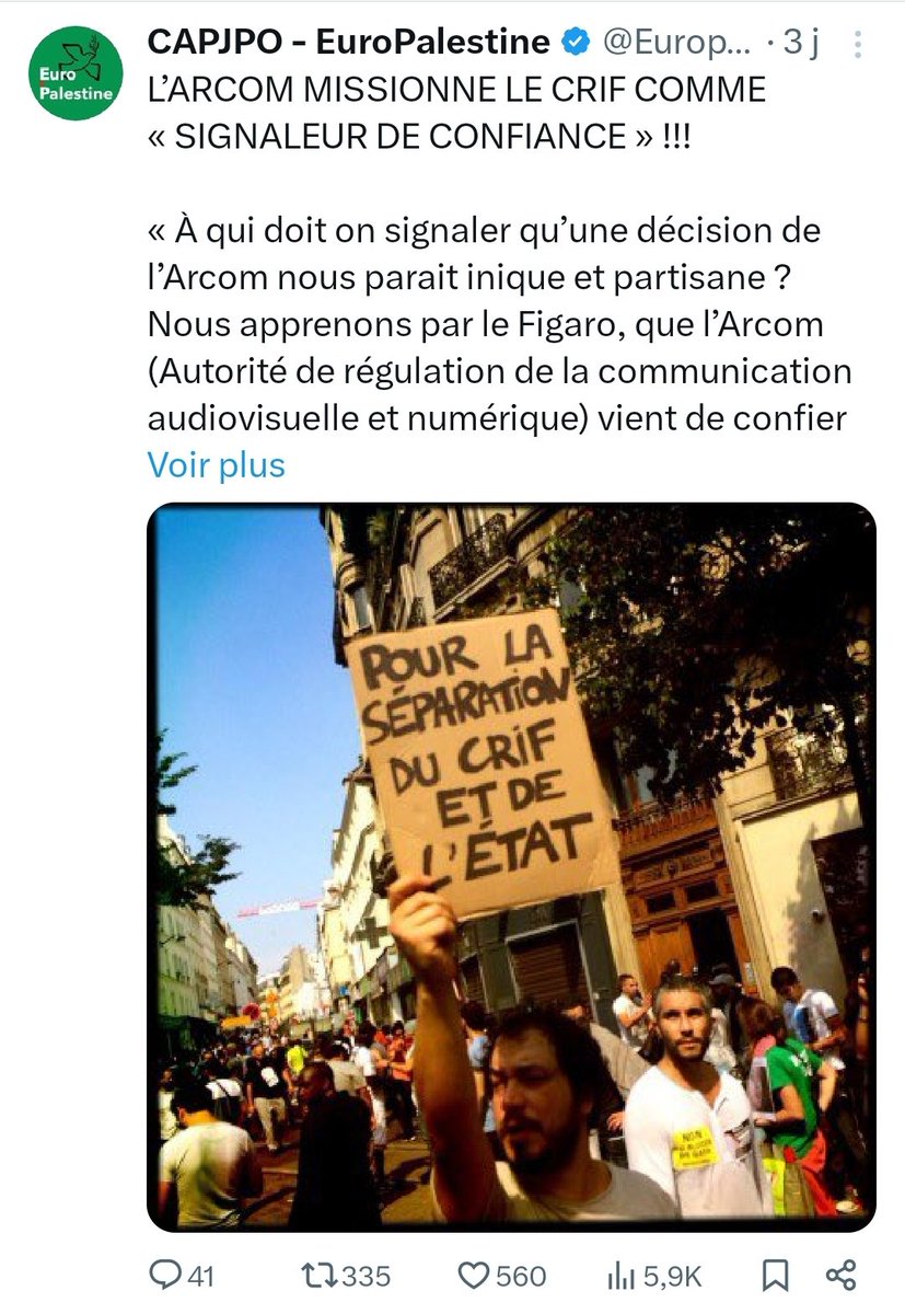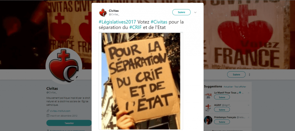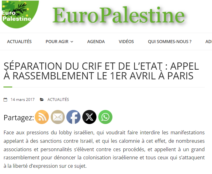 2017. Manifestation pour "la séparation du crif et de l'état", dans la droite continuité de l'extrême droite française à l'instar de Civitas la même année ou de la “séparation de la Synagogue et de l’État” réclamée par l'ancien collaboPierre Sidos, le 6 février 1959,