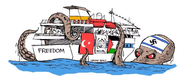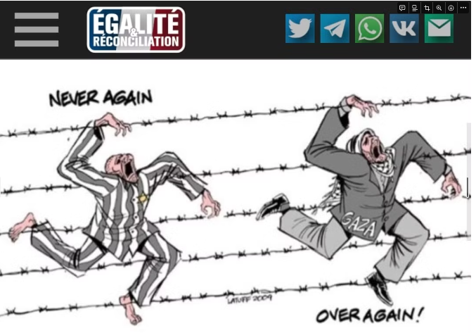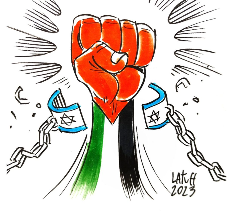 2023. 7 octobre. Europalestine jubile des massacres commis par le Hamas et relaie une caricature de l'antisémite/négationniste Latuff (personne régulièrement invitée par Europalestine) qui avait été primé au festival du dessin négationniste en Iran