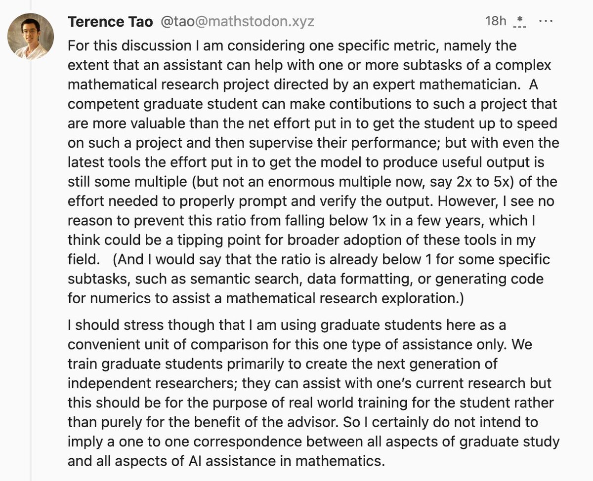 1/n Terrence Tao, arguable the most gifted living mathematician has tried GPT-o1 and this is his verdict: "However, this was an improvement over previous models, whose capability was closer to an actually incompetent graduate student. It may only take one or two further iterations of improved capability (and integration with other tools, such as computer algebra packages and proof assistants) until the level of "competent graduate student" is reached."