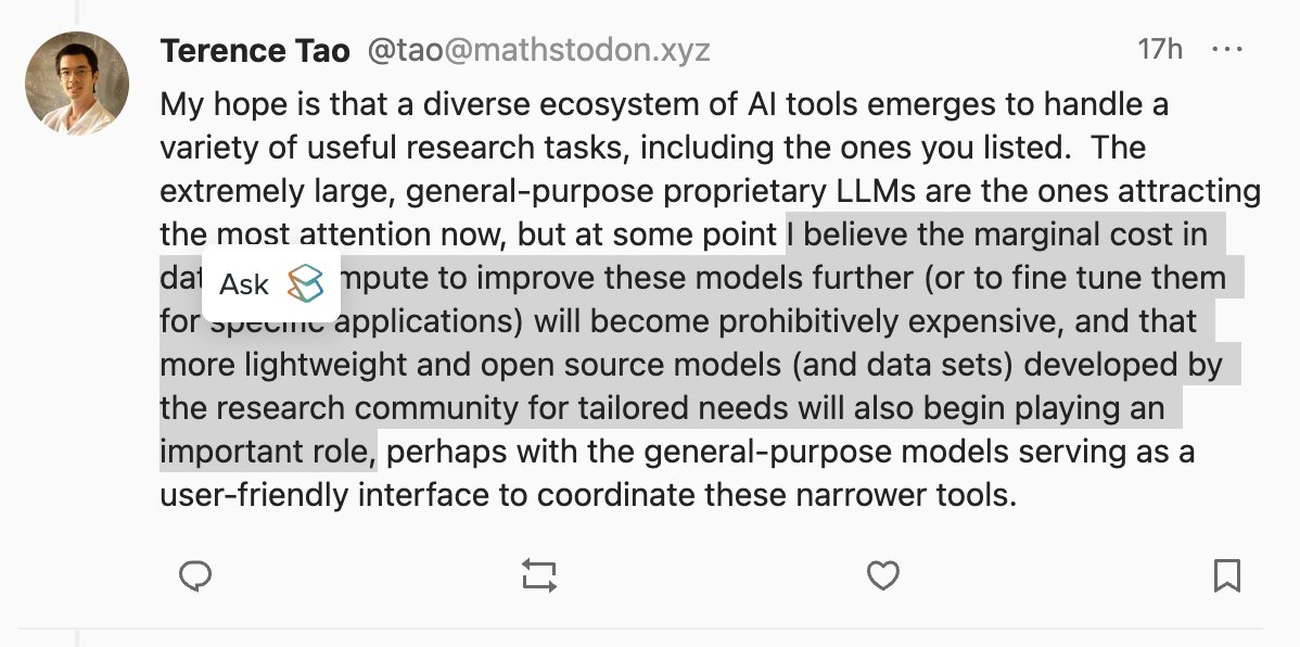 4/n Terrence Tao sees the potential of open-source models playing an important role as the GPU-rich players hit limits. What this implies is the need to improve one's own skill in building specialized smaller models for various domains.