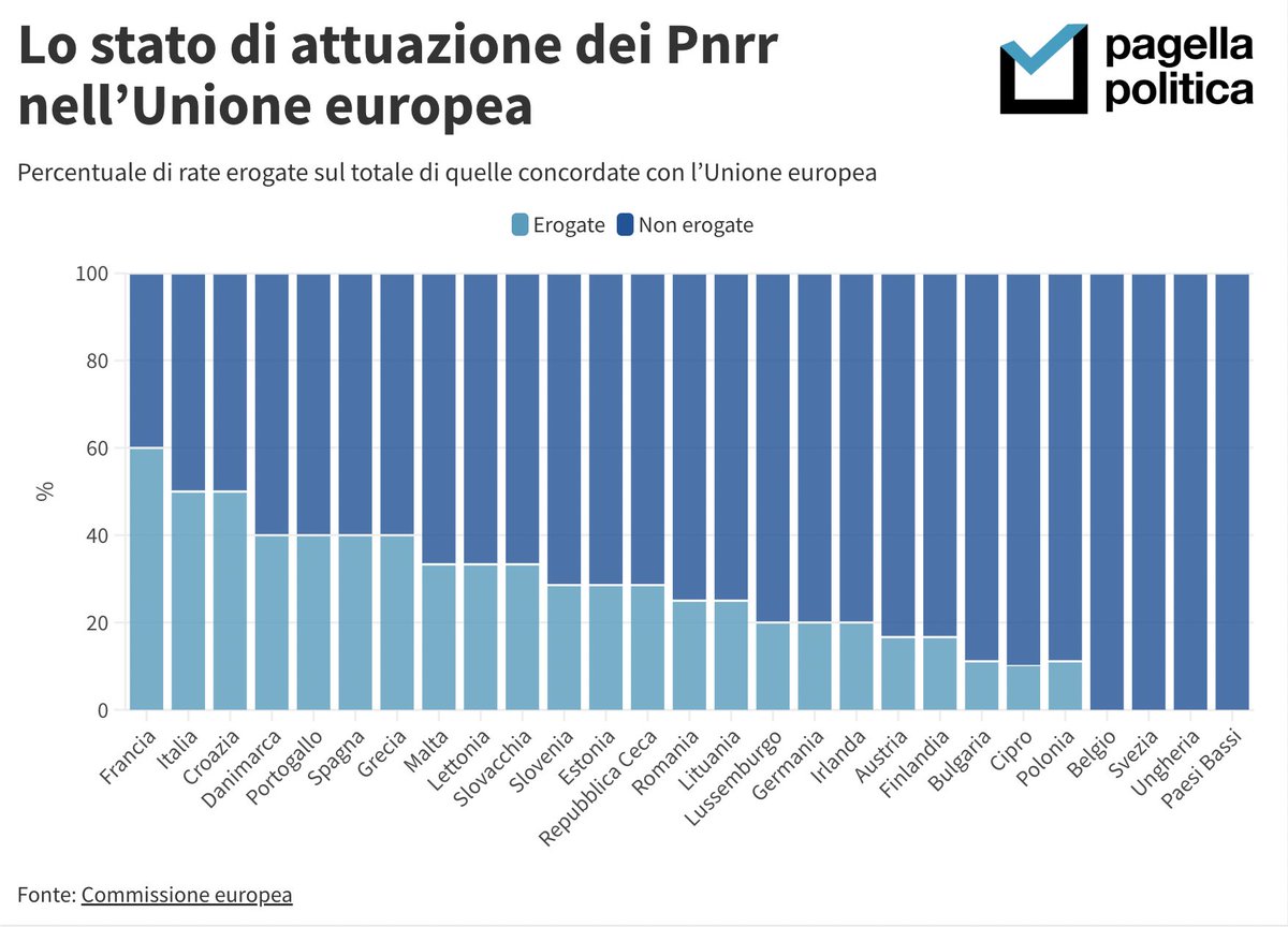 💰 Finora l’Ue ha erogato 5 rate su 10 all’Italia, così come alla Croazia. Ma non tutti i piani si basano su 10 rate. Per esempio la Francia ha ricevuto 3 rate su 5, il 60%, ed è davanti all’Italia.