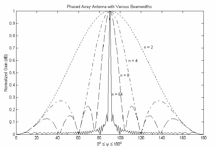 It shows the wide beam of smaller arrays (from 2 antennas wide) and the narrow beam of a medium sized array (up to 64 antennas wide)