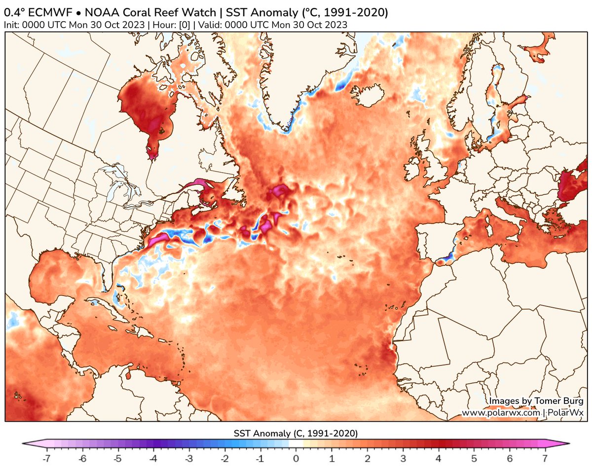 L’Océan Atlantique est record chaud (👇écart a la référence 1991-2020).