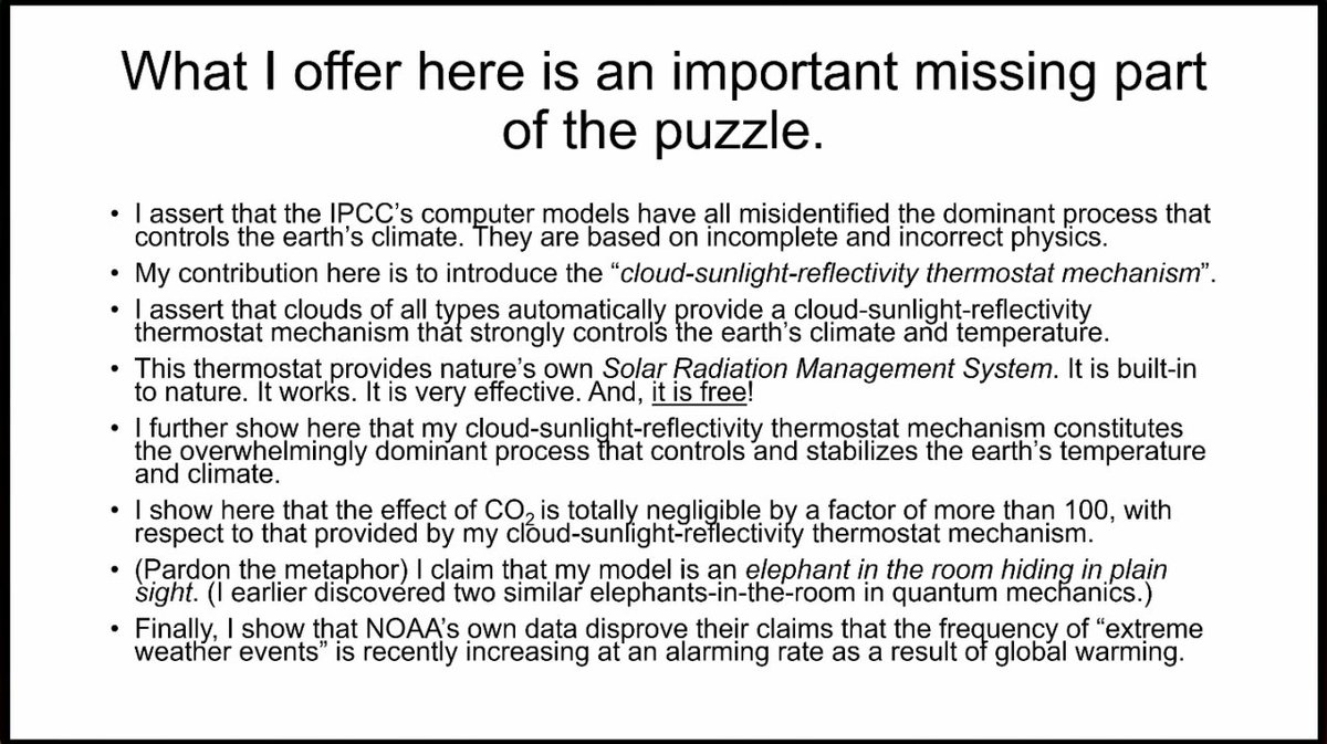 Jusqu'à présent, nous avons totalement mal identifié quel est le processus dominant qui contrôle le climat, et tous les différents modèles sont basés sur une physique incomplète et incorrecte.