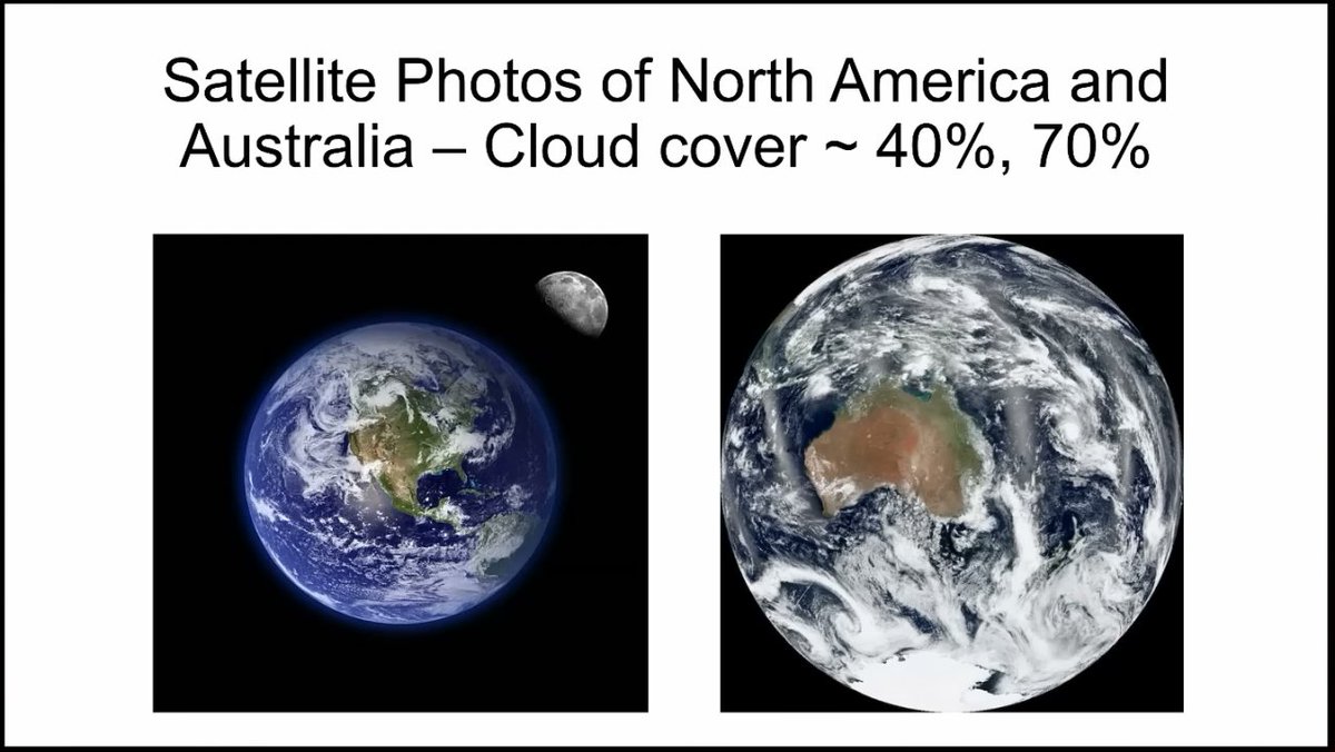 Les deux tiers de la Terre sont recouverts d'océans. Rien que l'océan Pacifique représente la moitié de la Terre. La couverture nuageuse moyenne de la Terre est de 67% ; environ 50% sur les terres et 75% sur les océans.