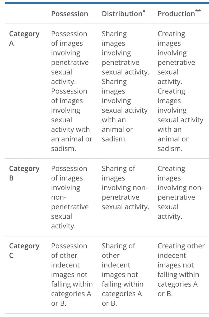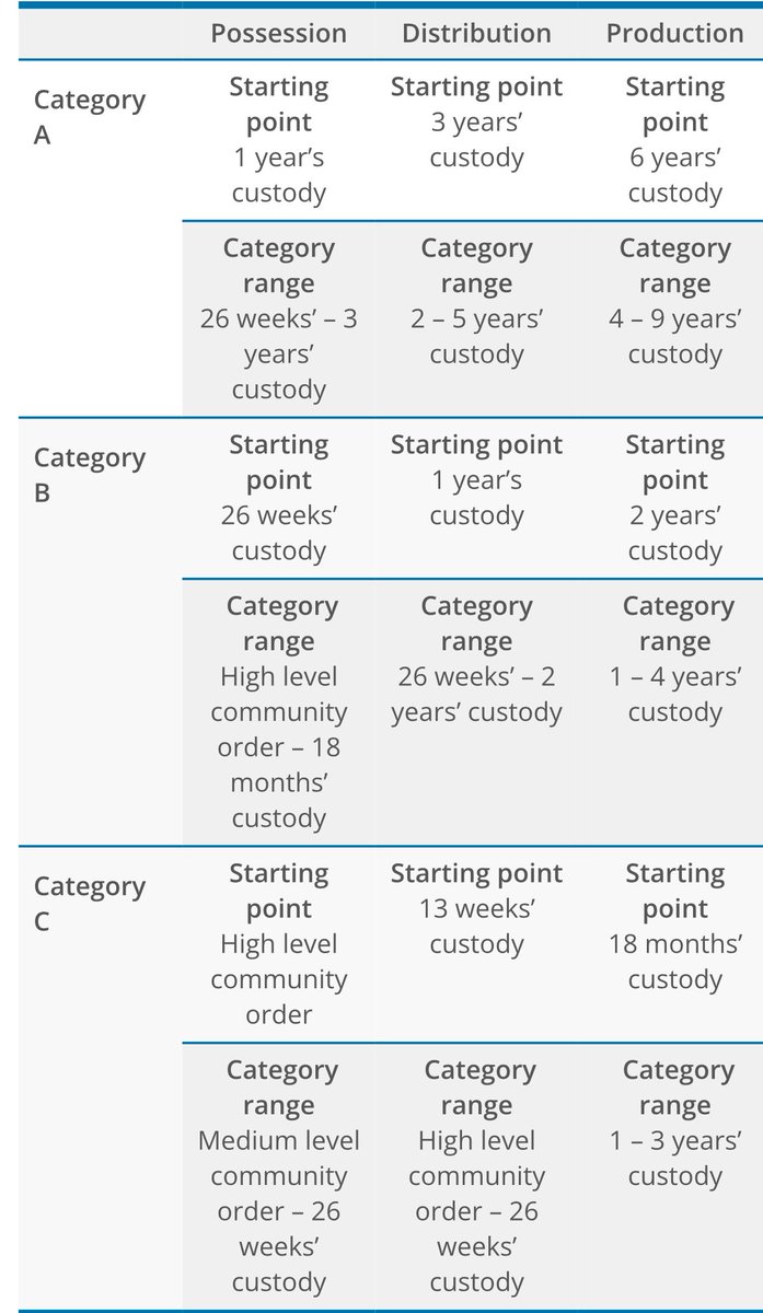 Possessing Category A images (the most serious) carries a starting point of 1 year’s custody, with a range from 26 weeks to 3 years.