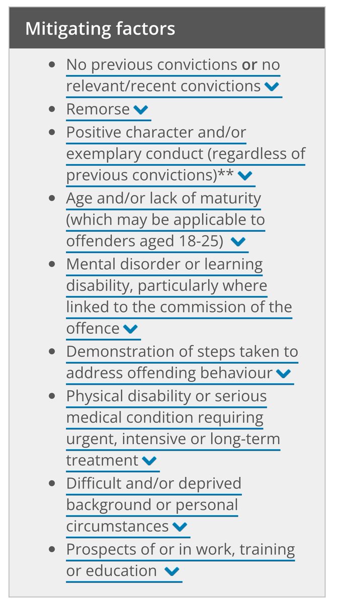 If the court finds that a mental disorder acted to mitigate an offender’s culpability (see the Guideline above for details), this may serve to reduce the sentence.