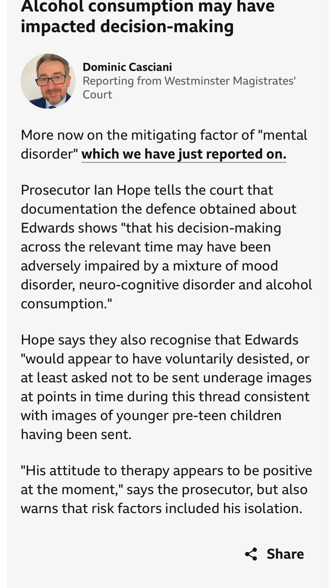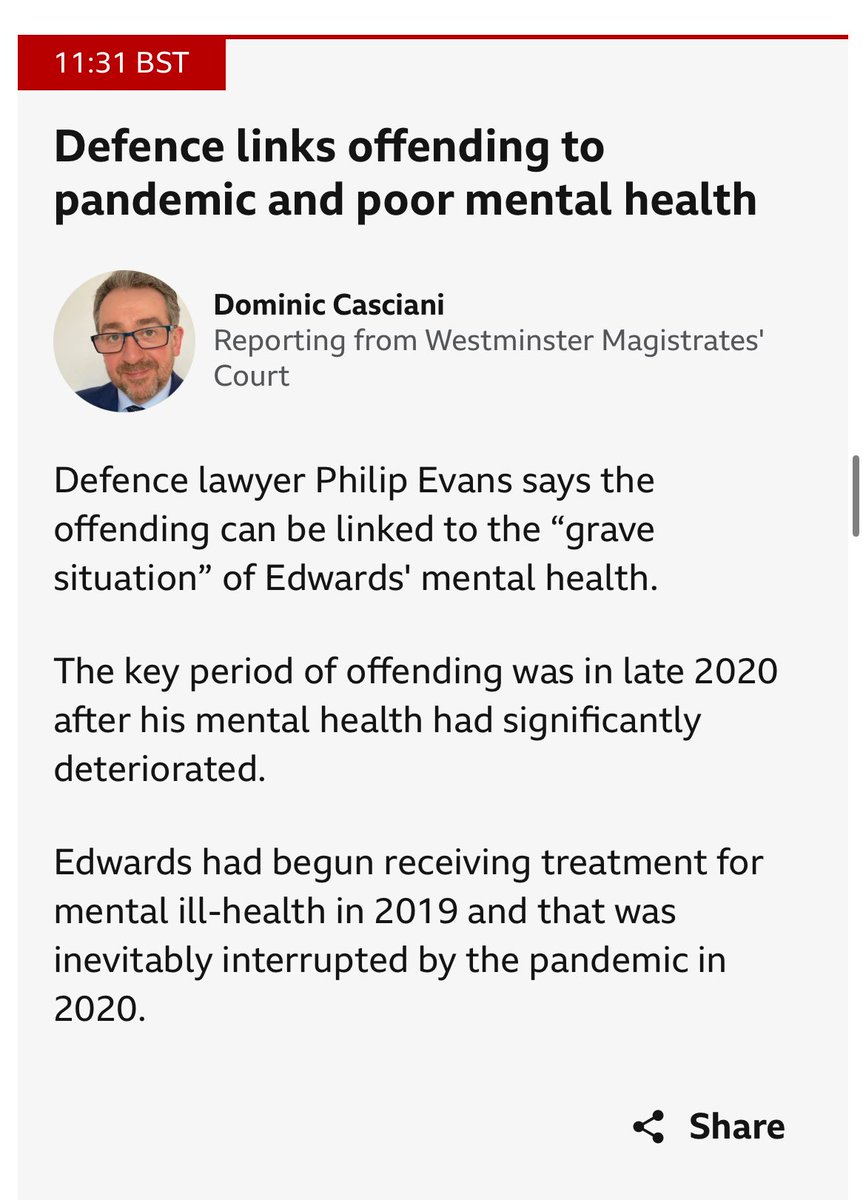 A relevant feature in mitigation was Edwards’ mental health. There was evidence (expert reports) relating to this. And there is a separate Guideline- Sentencing offenders with mental disorders, developmental disorders, or neurological impairments: sentencingcouncil.org.uk/overarching-gu…