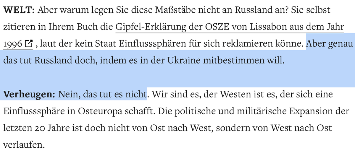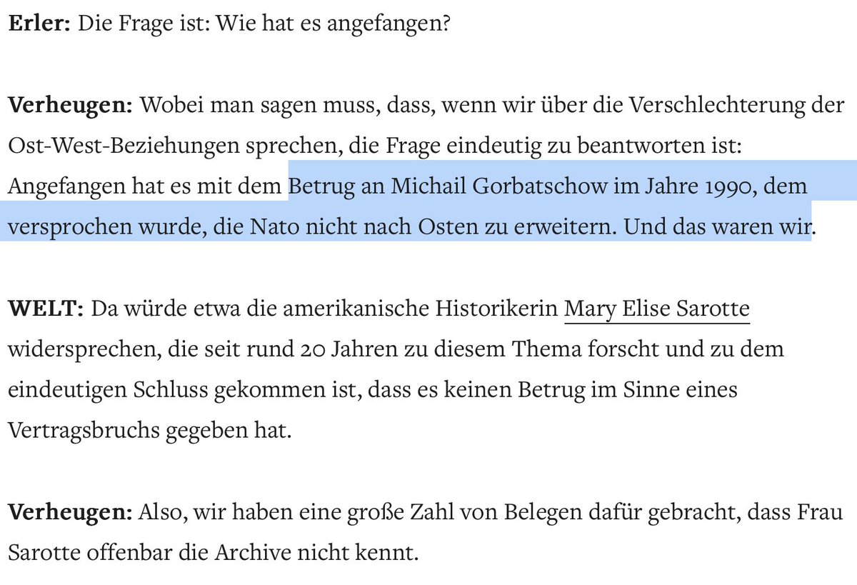 Verheugen/Erler denken in Kategorien einer Sandkasten-Keilerei und wärmen die Mär vom "Betrug" an Russland auf (das damals zwar noch die SU war und nicht betrogen wurde - aber Fakten sind ihnen egal, lieber unterstellen sie einer Historikerin, keine Archive besucht zu haben. 3/