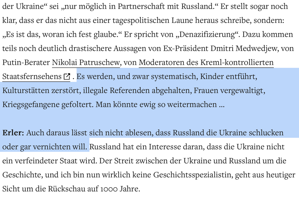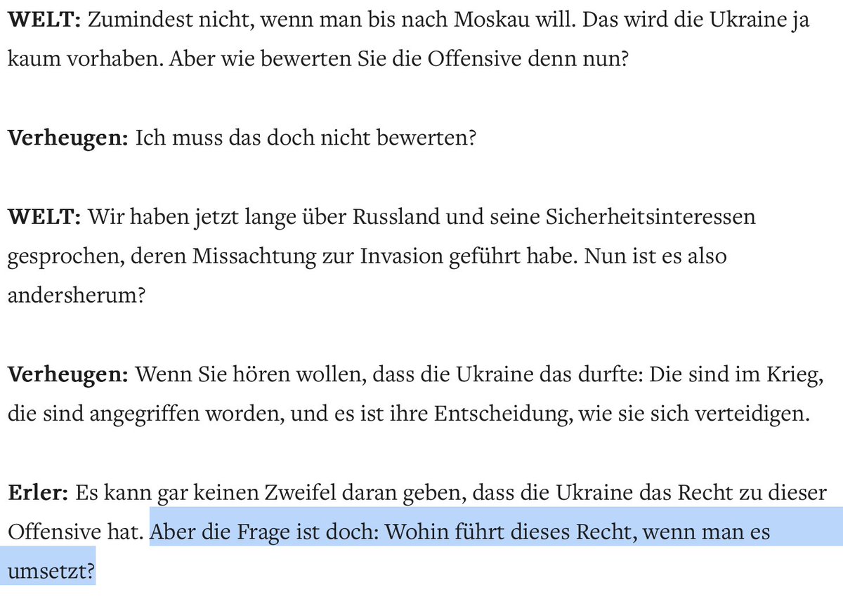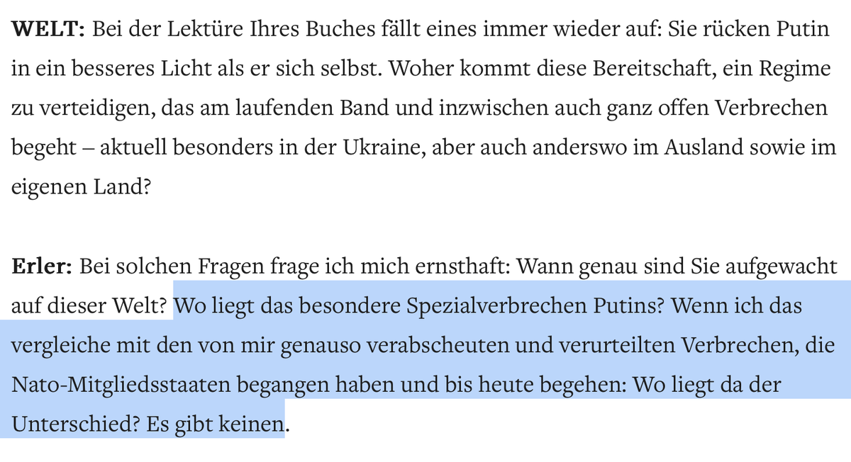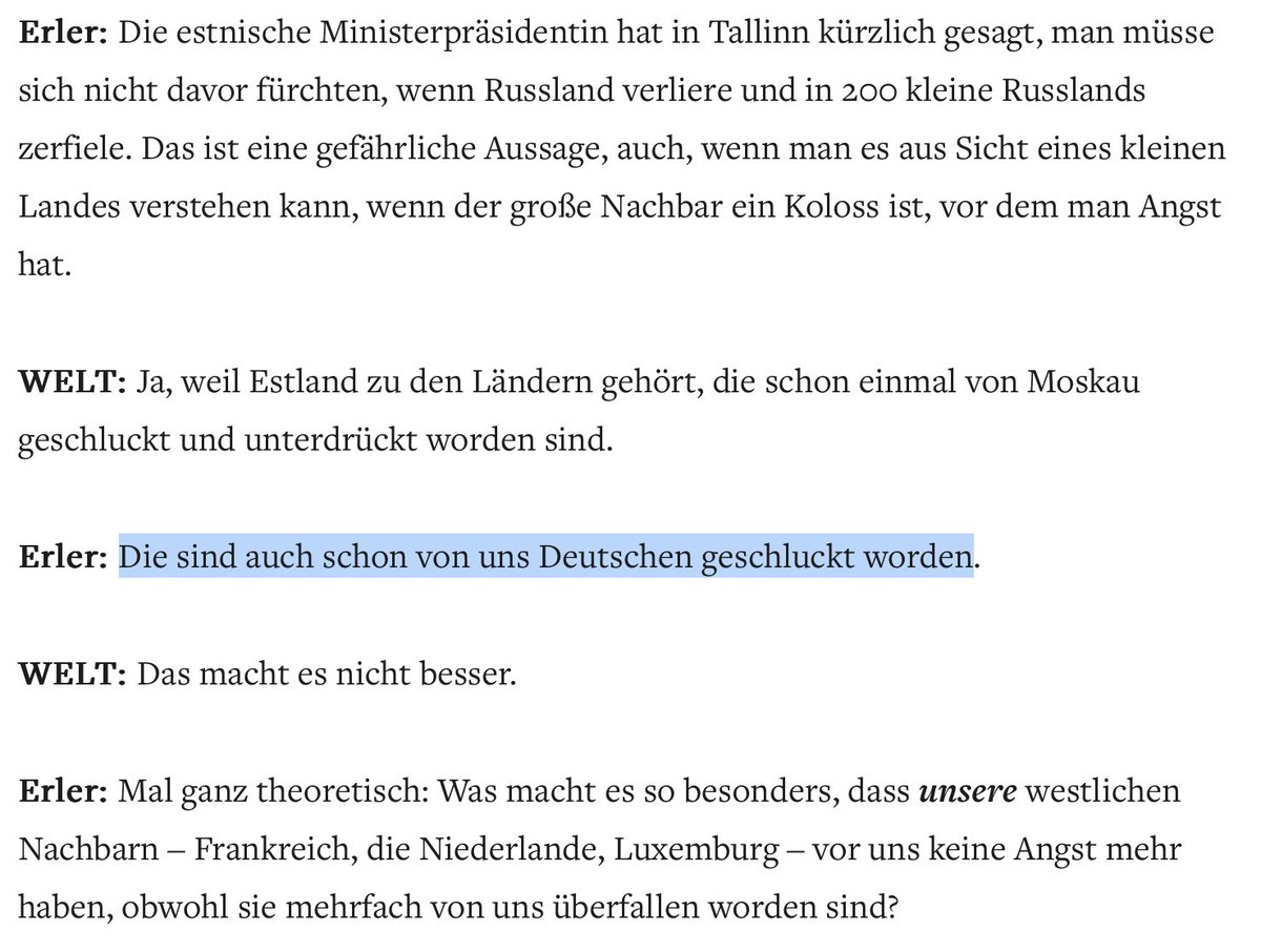 Die @welt konfrontiert sie mit diesen Unterschieden - doch Erler reagiert mit der Präventivkriegsthese, die so auch vom Kreml verbreitet wird: Die UA als eine Art "Anti-Russland", das die USA benutzen, um die Weltherrschaft zu erlangen. Fehlt nur noch der Begriff "Ostküste"... 5/