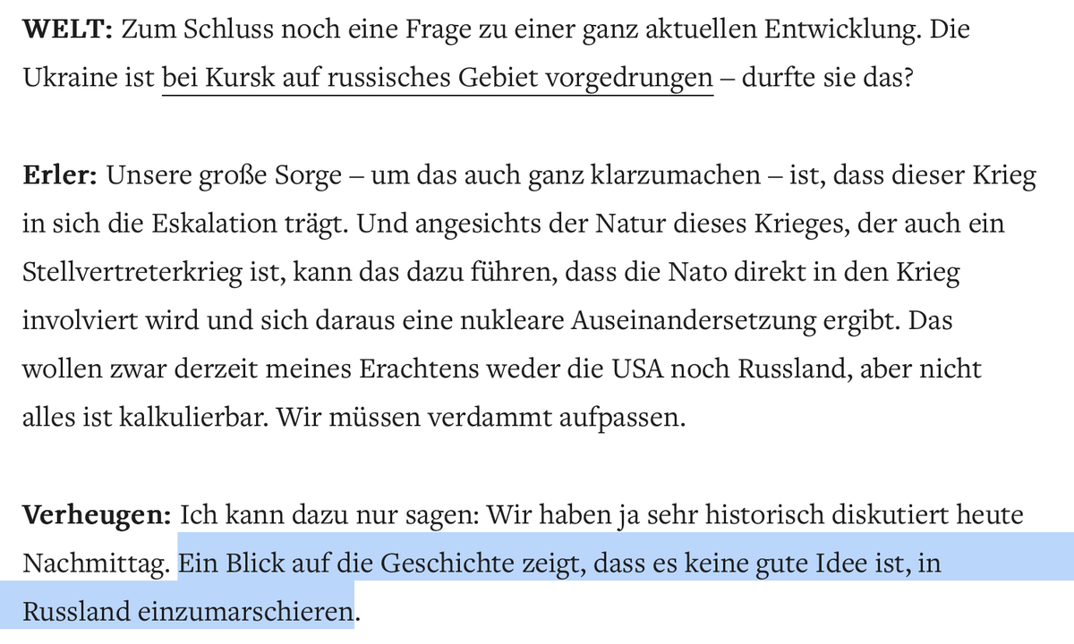 @welt Auf was soll man von diesem Mann erwarten, der allen Ernstes den winzigen Vorstoß der Ukrainer in der Region Kursk mit den Invasionen Napoleons 1812 und Deutschlands 1941 gleichsetzt? 14/