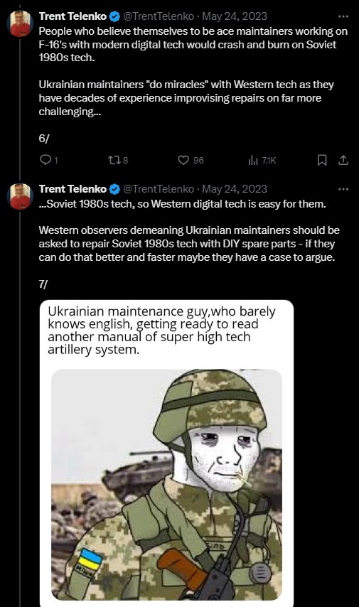 The "Western Military Experts" that Politico talked to in early 2023 were made fools of by the information on Ukrainian maintainer performance in the @ralee85 post above.