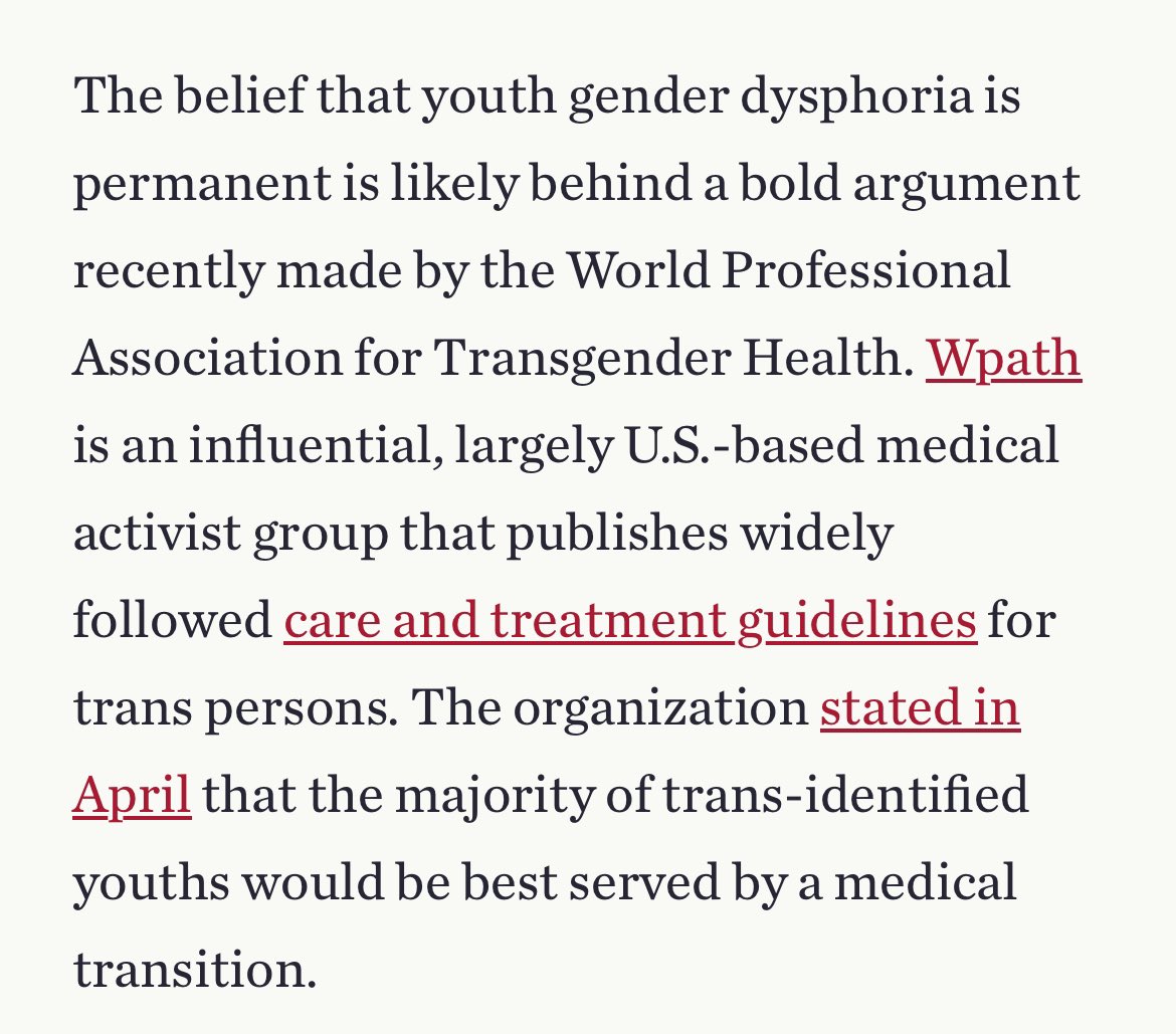 The belief that youth gender dysphoria is permanent is likely behind a bold argument recently made by the World Professional Association for Transgender Health. Wpathis an influential, largely U.S.-based medical activist group that publishes widely followed care and treatment guidelines for trans persons. The organization stated in April that the majority of trans-identified youths would be best served by a medical transition.
