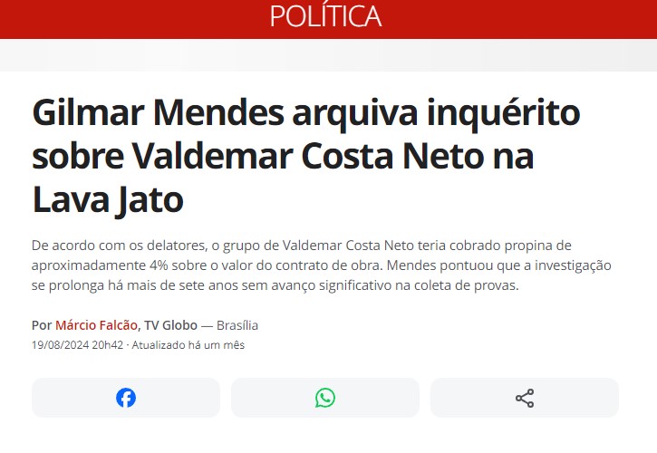 25. Em 19 de agosto de 2024, o ministro Gilmar Mendes arquivou um inquérito contra Valdemar Costa Neto na Lava Jato.