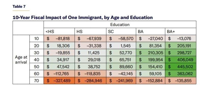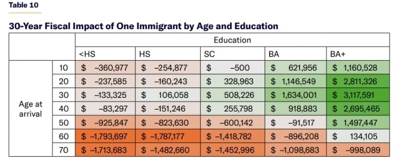 An immigrant who comes to the US between ages 25 and 34 with a Bachelor’s degree is expected to pay $478,000 in taxes and receive $303,000 in government benefits over his life.