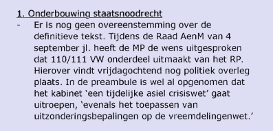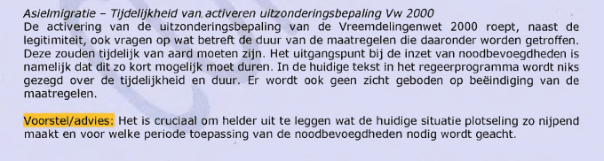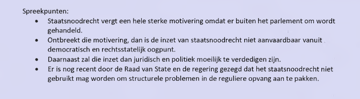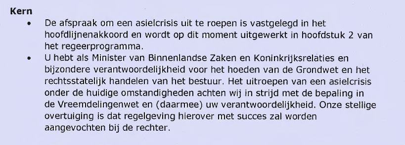 Ambtenaren wijzen minister van BZK op "bijzondere verantwoordelijkheid voor het hoeden van de Grondwet en het rechtsstatelijk handelen van het bestuur". Uitroepen van asielcrisis "in strijd met Vreemdelingenwet en uw verantwoordelijkheid" (richting minister).