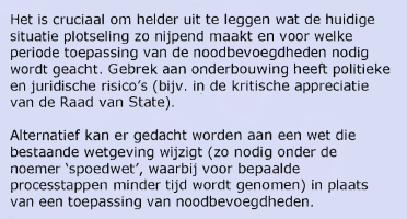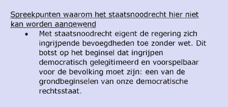 "Met staatsnoodrecht eigent de regering zich ingrijpende bevoegdheden toe zonder wet", volgens ambtenaren een botsing met "grondbeginselen van de rechtsstaat".