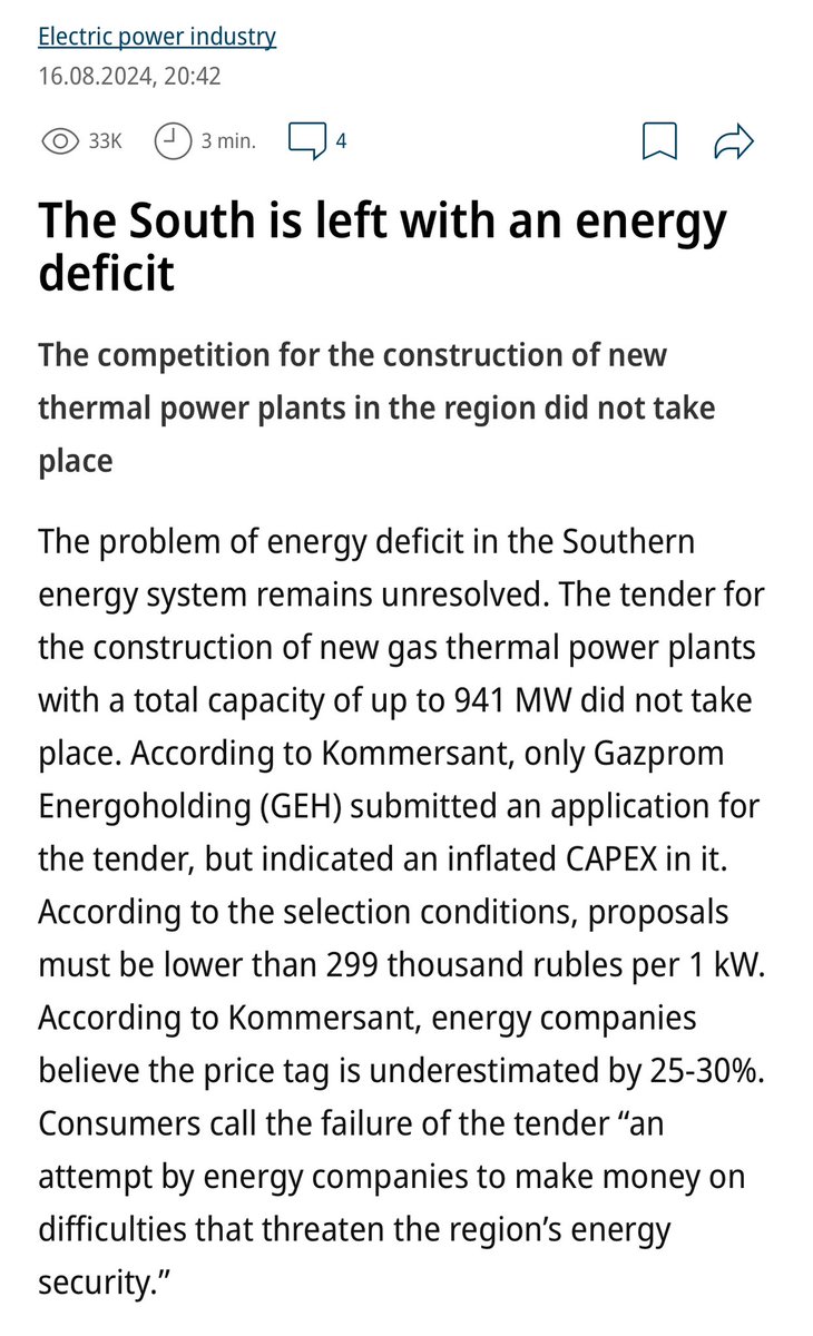 Also, back in August, this article came out discussing the failure to secure bids for a new thermal power plant for the Southern energy system.