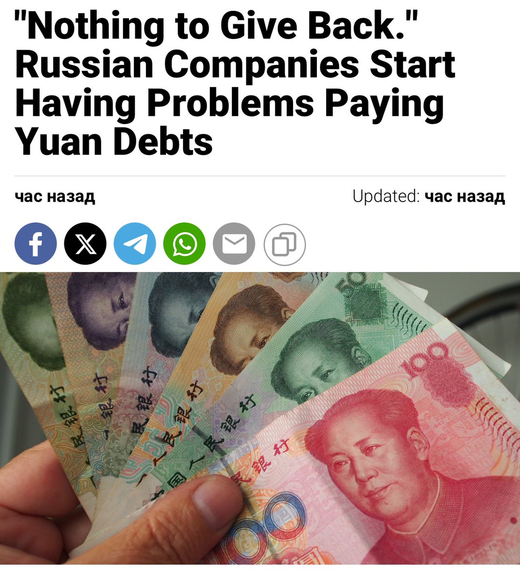 ‼️ “Large Russian businesses have encountered problems with repaying debts in Chinese yuan, which they have been accumulating since the start of the war in Ukraine, following the Kremlin's directive to move away from "toxic" currencies.”
