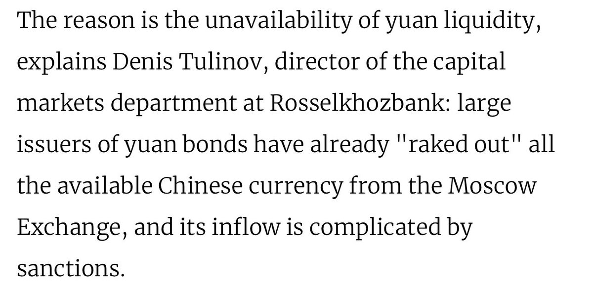 “large issuers of yuan bonds have already "raked out" all the available Chinese currency from the Moscow Exchange, and its inflow is complicated by sanctions.”