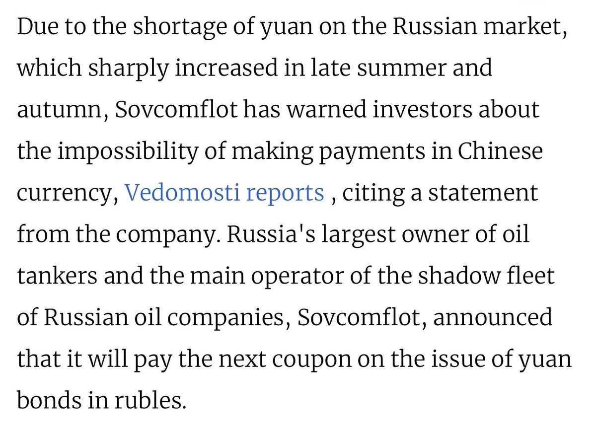 “Russia's largest owner of oil tankers and the main operator of the shadow fleet of Russian oil companies, Sovcomflot, announced that it will pay the next coupon on the issue of yuan bonds in rubles.”