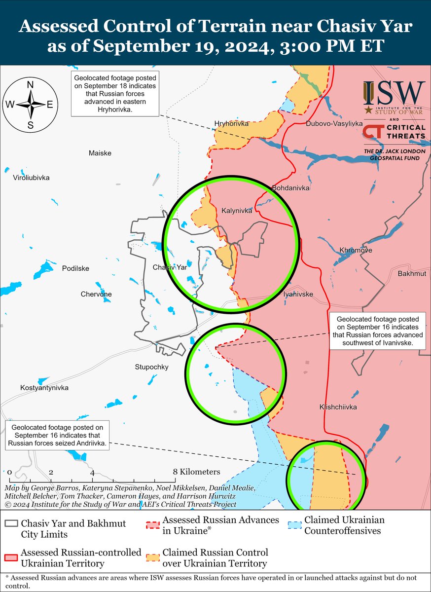 Russian forces also recently marginally advanced north of Chasiv Yar. (1/2)