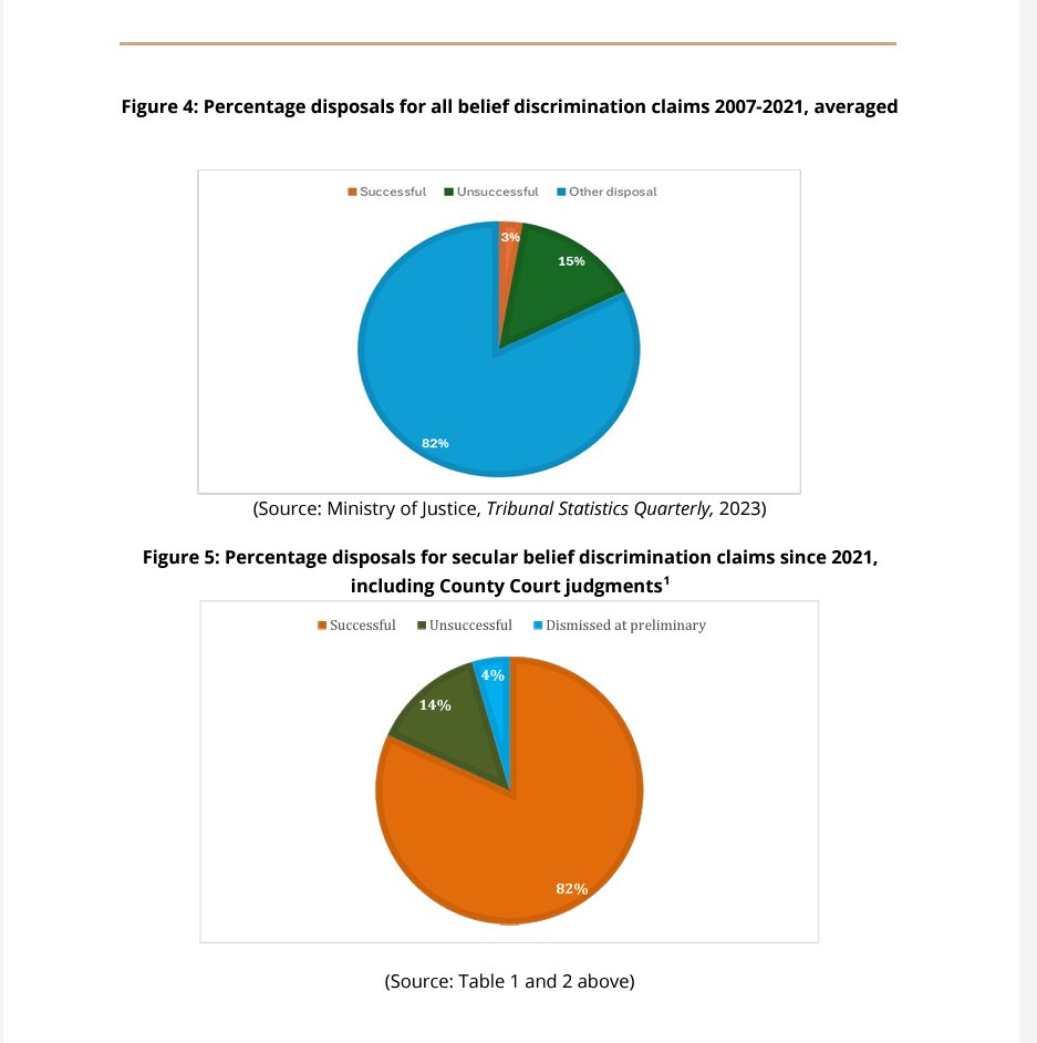 2. Discrimination on belief grounds is a tiny fraction of the overall claims - the majority of which are for breach of contract, race, disability or sex discrimination. Belief discrimination cases total circa 1-3% of all ET claims with the percentage falling.
