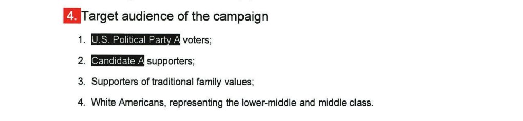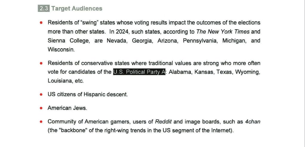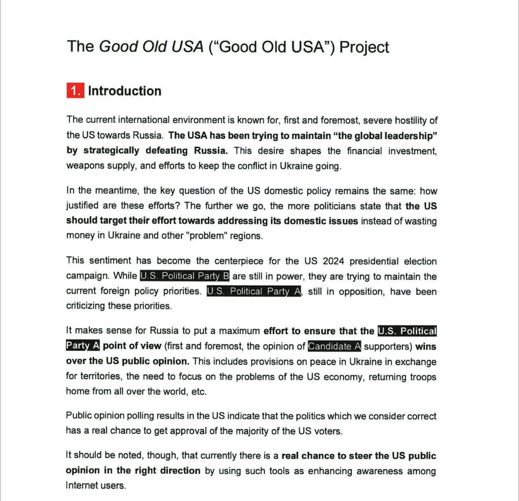 Todisteessa 8A, Good Old USA Project, on eräitä muitakin kiinnostavia yksityiskohtia. Sekin on käännös venäjänkielisestä suunnitelmasta, jonka tavoitteena on varmistaa "USAn Poliittinen Puolue A:n" "Ehdokas A:n" voitto USAn presidentinvaaleissa 2024.