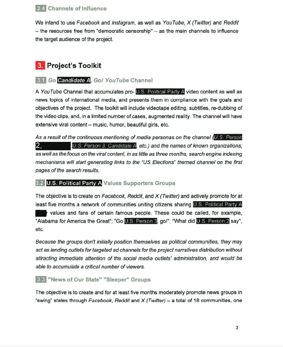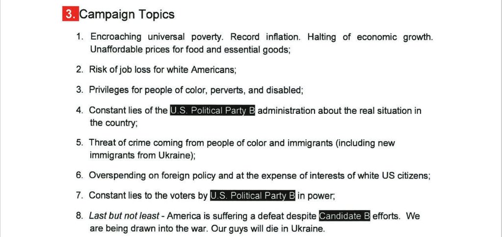 "Venäjän on järkevää käyttää kaikkia keinoja, että 'Puolue A:n' näkökulma (etenkin 'Ehdokas A:n' kannattajien mielipide) voittaa kamppailun USAn julkisesta mielipiteestä."