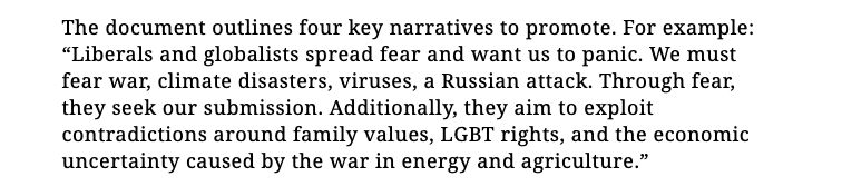- "Liberaalit ja globalistit pelottelevat sodalla, ilmastokatastrofilla, viruksilla..."