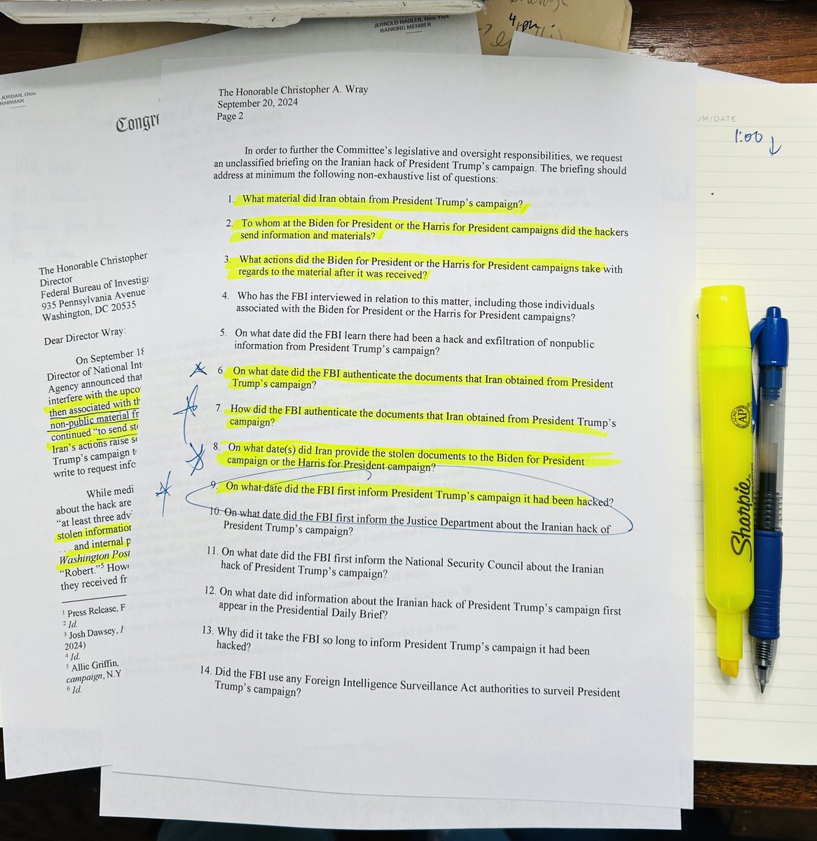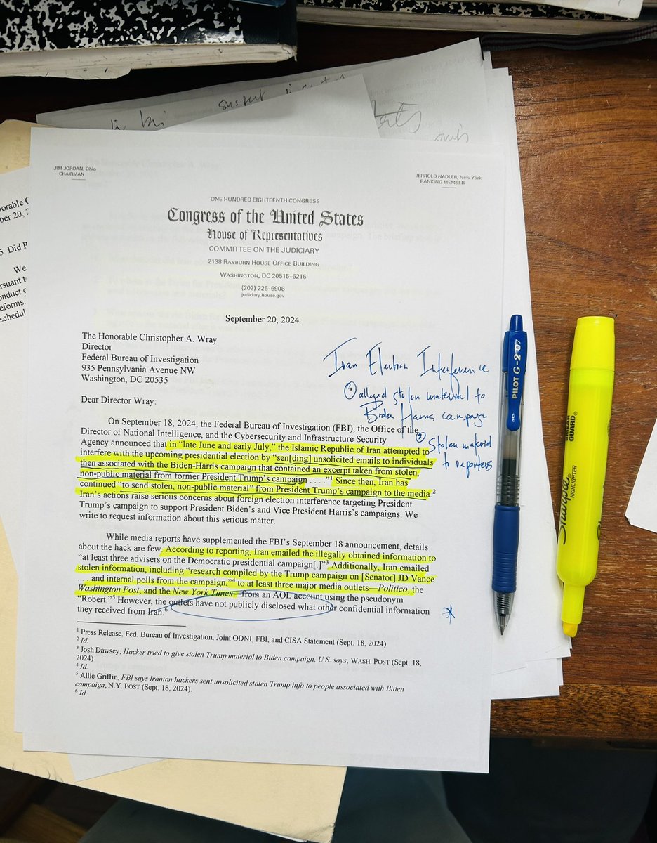 BREAKING: @JudiciaryGOP @Jim_Jordan demand immediate @fbi briefing on Iranian Hack of Trump campaign